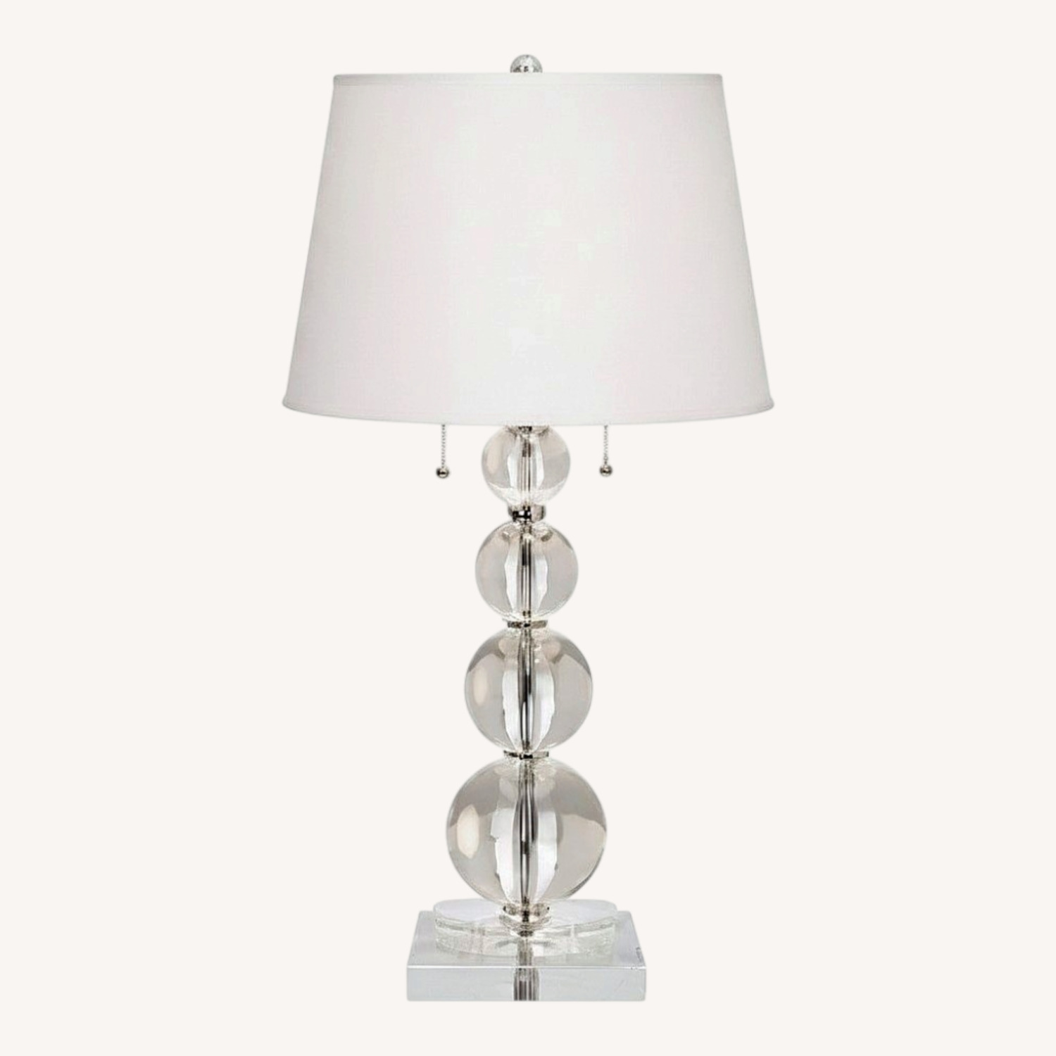 Stacked crystal globes provide an alluring profile on this modern lamp design from the Vienna Full Spectrum brand of lighting. The crystal glass spheres get smaller as they reach upwards, and at the very top of the design is a tapered drum lamp shade in a white fabric. Twin chain pulls and a ball finial finish add to the look of sophistication. The lamp also comes with a real black marble riser that can be used to give the design extra height and style.