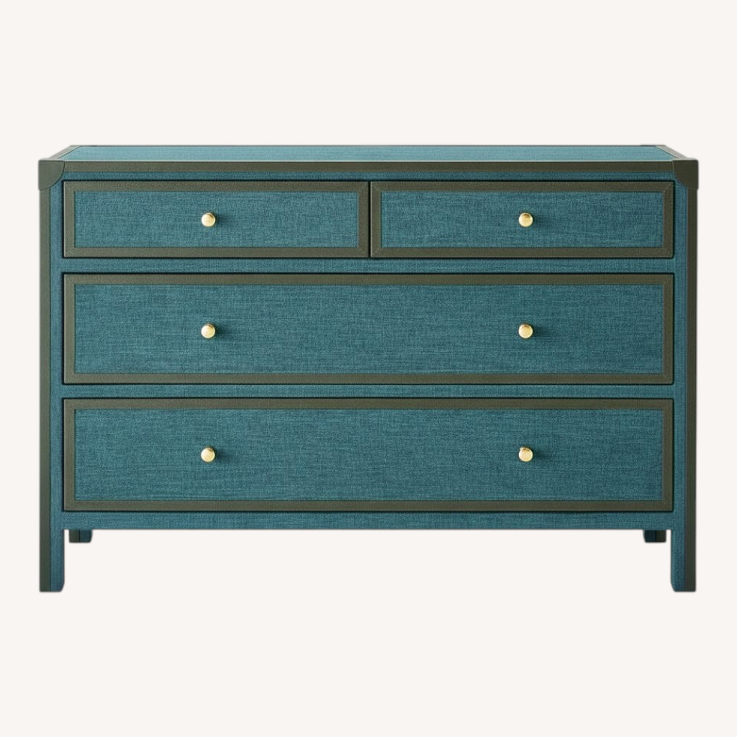 Elevate any bedroom, entryway, or dressing space with this brand new, custom‑made dresser by MADE GOODS, a brand celebrated for its sculptural forms, artisanal finishes, and impeccable craftsmanship. This bespoke piece combines textured fabric‑wrapped surfaces with leather trim and detailing, creating a refined, tactile contrast that feels both modern and timeless.