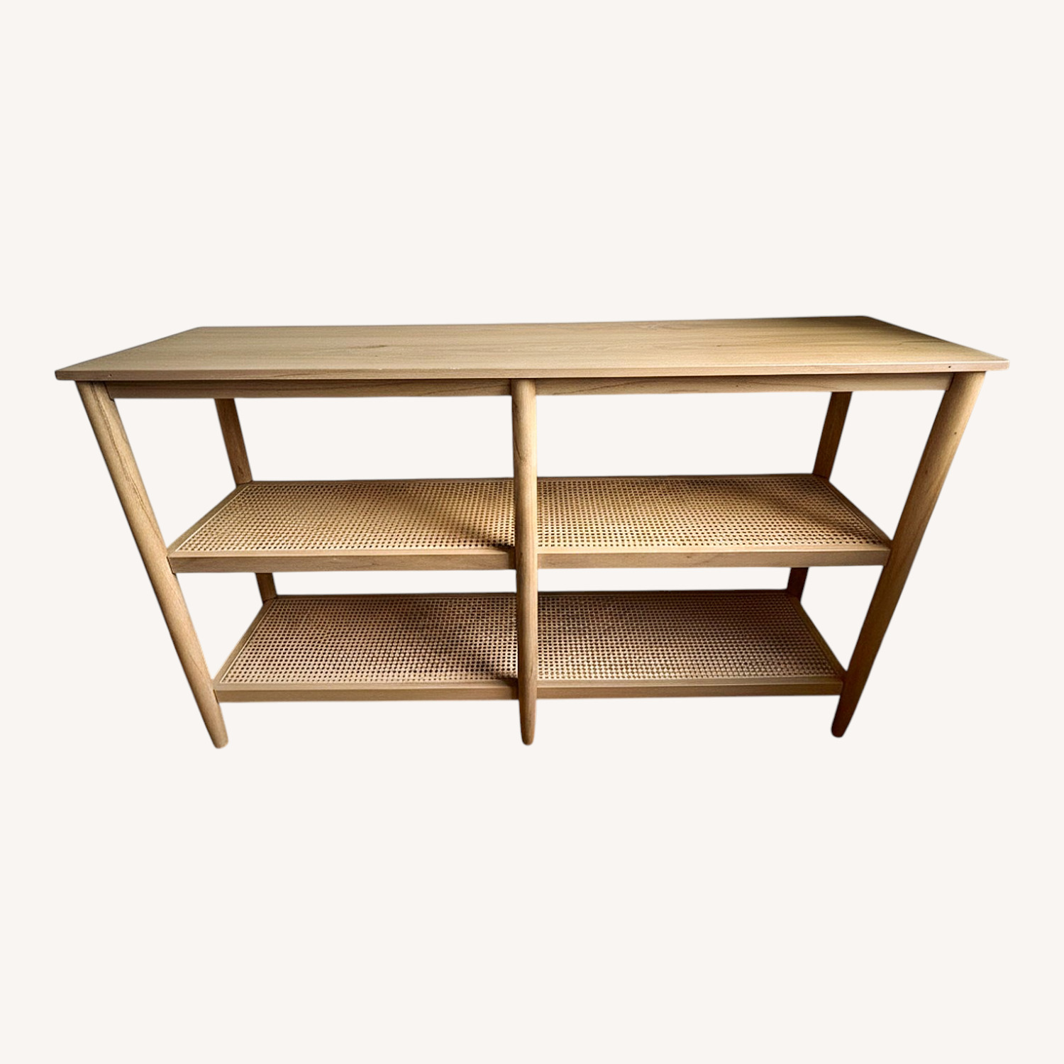 Seller's Notes:In great shape. Doesn’t fit in my new place. A compact three-tier design for space-saving storage. Top wooden shelf and two cane-inlaid shelves beneath.
