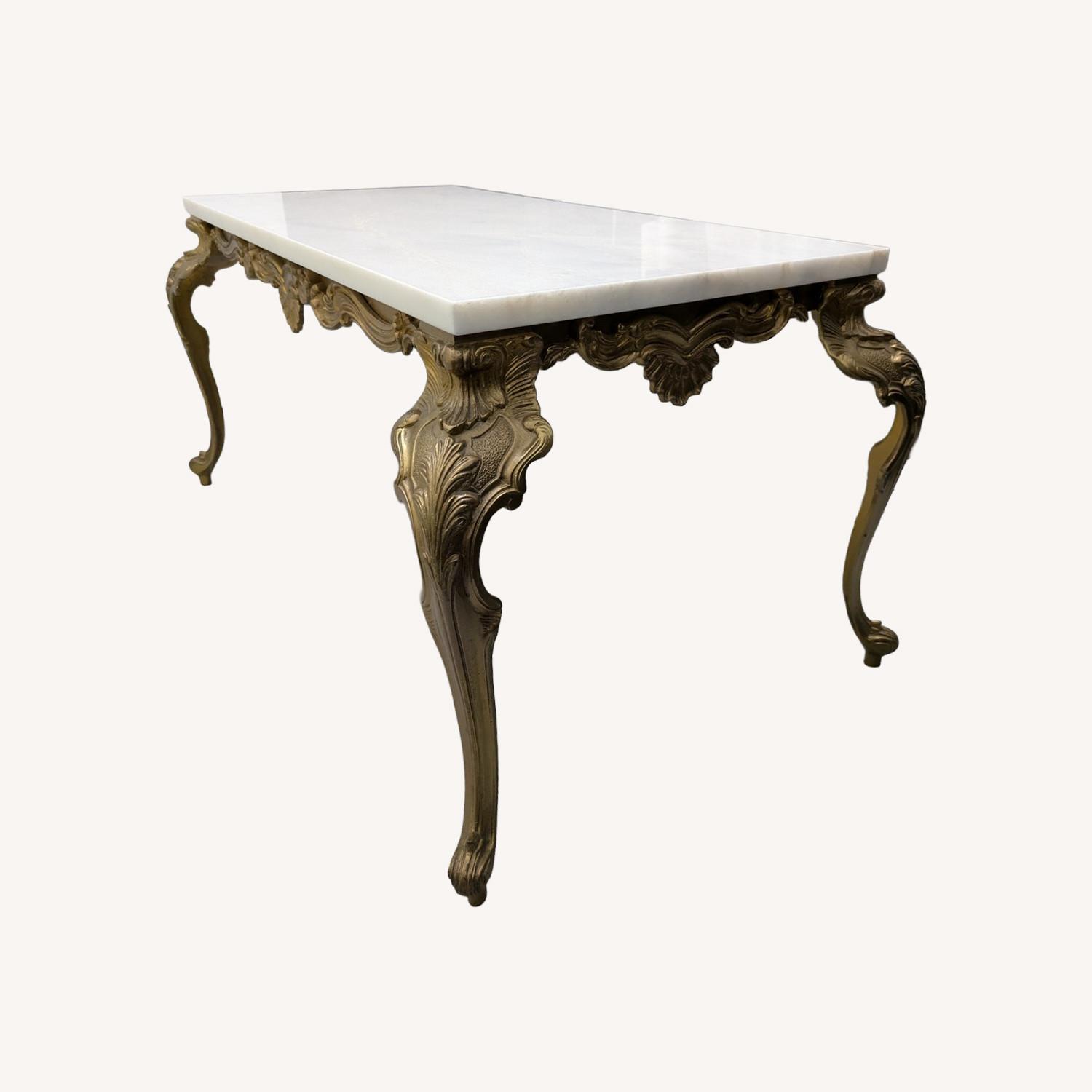 Seller's Notes:I have a custom-made beautiful coffee table. Table is compact in size, however; very elegantly designed. Modern white-tone Marble top with a Straight edge surface. The legs are elegantly crafted, with a sleek yet traditional feel. Brass legs. This table will be an enhancer to any given room! The product has barely been used, yet up for sale - due to a recent remodeling.
