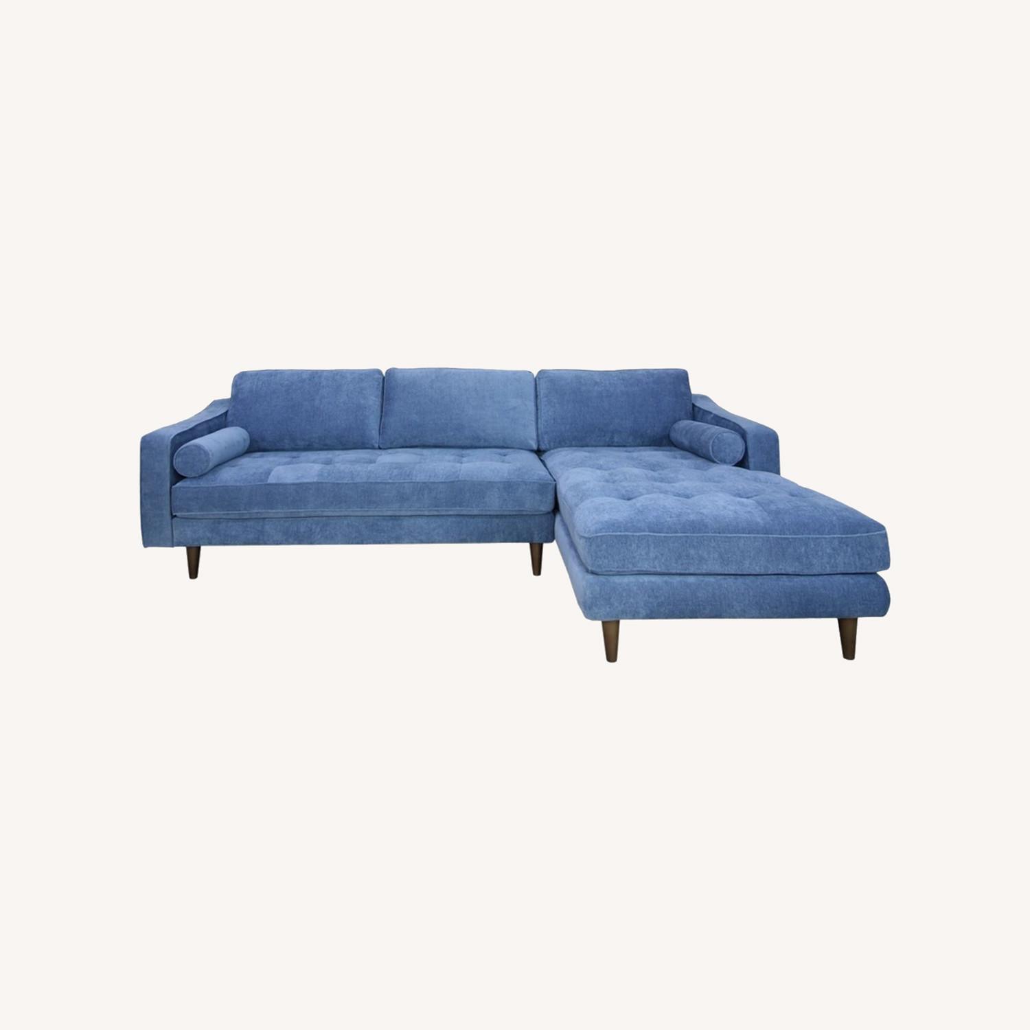 Used West Elm Andes blue velvet sectional with ottoman for sale on AptDeco