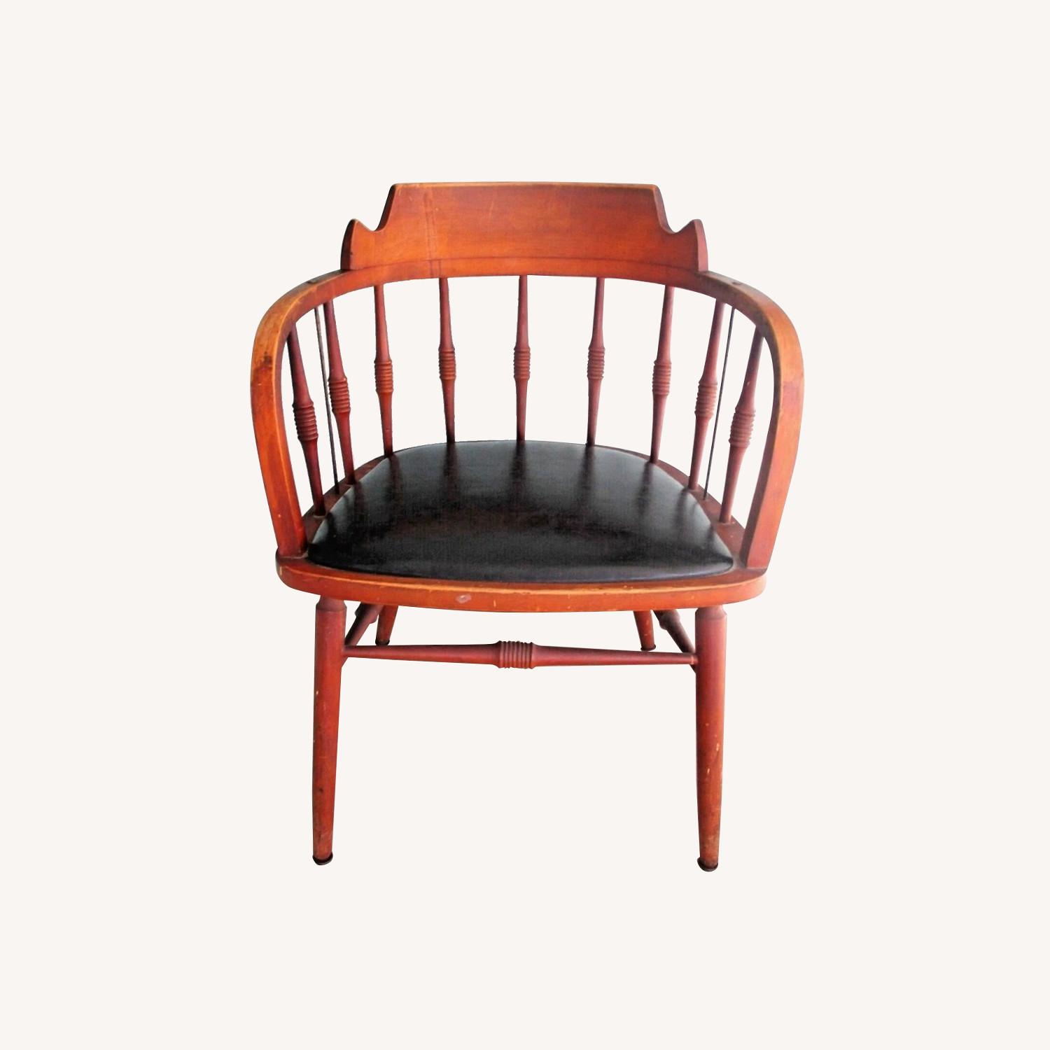 Seller's Notes:Matching Pair of Vintage 1958 Kipp Stewart Barrel Dining Accent Wood and Leather Arm Chairs Rare pair of solid wood Kipp Stewart barrel armchairs dated April, 1958. Each measures 29" H x 21" W x 22.5" D. The seat measures 17" H x 18" W x 16" D. The arm height is 26.5". The underside of each of the chairs denotes: "by Drexel" and "4/58". The bronze metal tie from arm to seat is a subtle statement of structure, making them possibly attributable to designer Kipp Stewart, who often incorporated details such as metal accents. Features include curved arms and back-rest of solid bentwood, not plywood. Doweling in the legs and stanchions is standout. The black leather upholstery is most likely original and in beautiful condition. This pair of chairs is in excellent vintage condition which is appropriate from age appropriate wear and tear. They are in excellent structural condition with no give to the legs.
