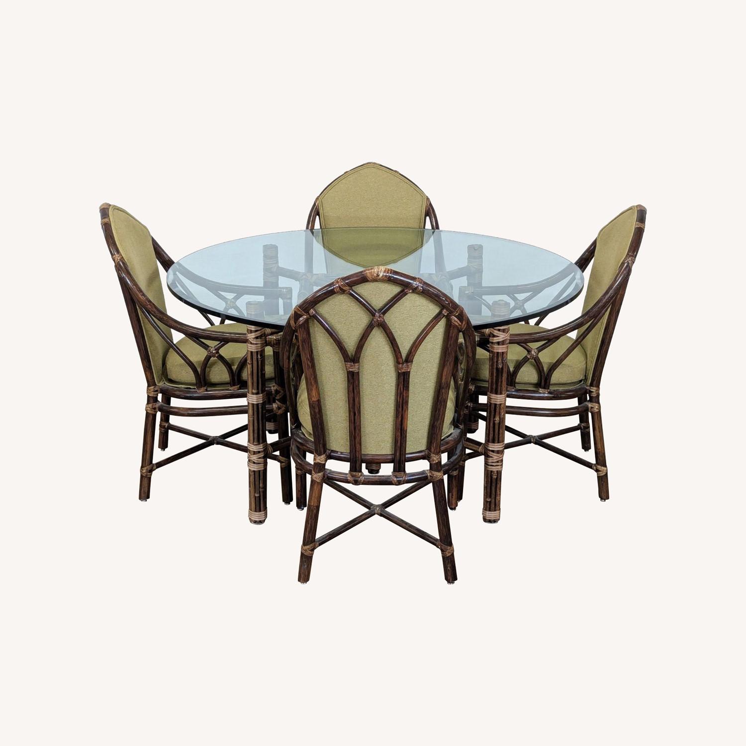 Seller's Notes:The bamboo pieces are lashed together with John McGuire's patented leather strap design. Topped with thick round glass with a beveled edge.
