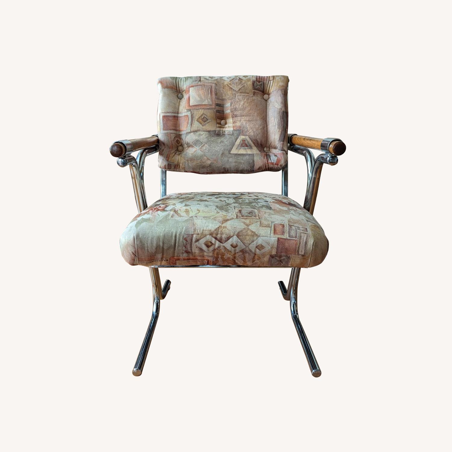 Seller's Notes:MCM Cleo Baldon Style Dining Chairs Set of 6 Chrome & Wood Amazing set of 6 arm chairs by Douglas of California. The wood arm rests nestle inside the chrome frame, very similar to Cleo Baldon, but the base is very similar to Jerry Johnson. Chairs were reupholstered by the previous owner, and could mesh well with a postmodern to mcm style home.