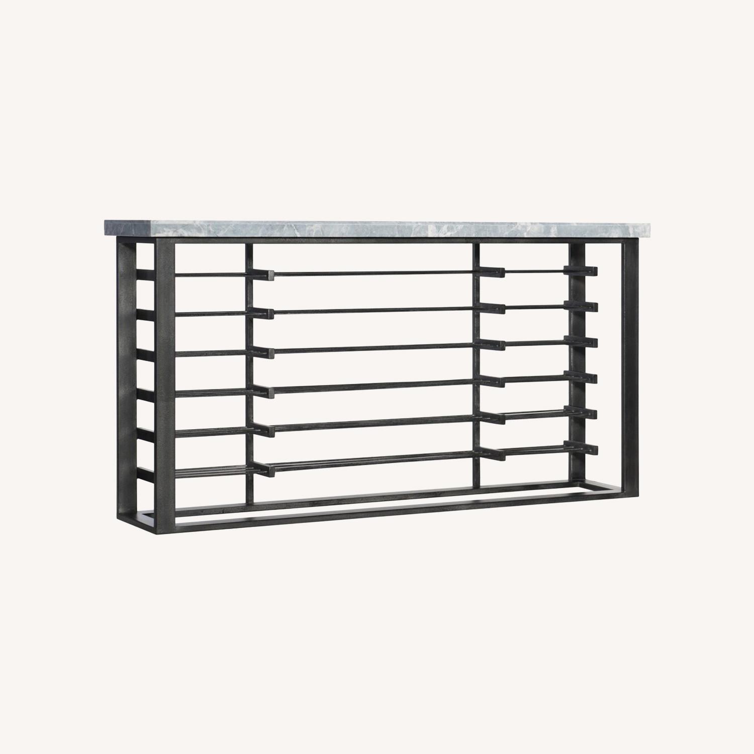 Seller's Notes:Modern wine rack console featuring a solid stone (marble-look) top paired with a black metal frame and integrated horizontal bottle storage. Designed to function as both a wine rack and bar console, this piece offers a clean, industrial silhouette while providing substantial storage for wine bottles and bar accessories.