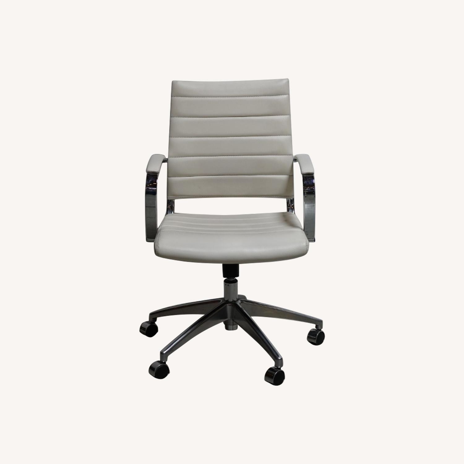 Seller's Notes:This executive chair completes your productivity station with contemporary style. Crafted from metal, it features a high contoured back with cushioned arms and a square seat wrapped in foam filling for a supportive feel. It's upholstered in animal-friendly faux leather with a solid neutral hue and detailed with plush channel tufting. This desk chair sits on a five-spoke steel base and boasts an adjustable height. Best of all, its caster wheels and 360-degree swivel let you easily move it around your space, giving you access to all of your surfaces. Light wear, great condition Contemporary Executive Office Chair with Padded Chrome Arms Mid-Back Design with lumbar support Waterfall Seat reduces pressure on your legs Tilt Tension Adjustment Knob adjusts the chair's backward tilt resistance LeatherSoft is leather and polyurethane for added Softness and Durability