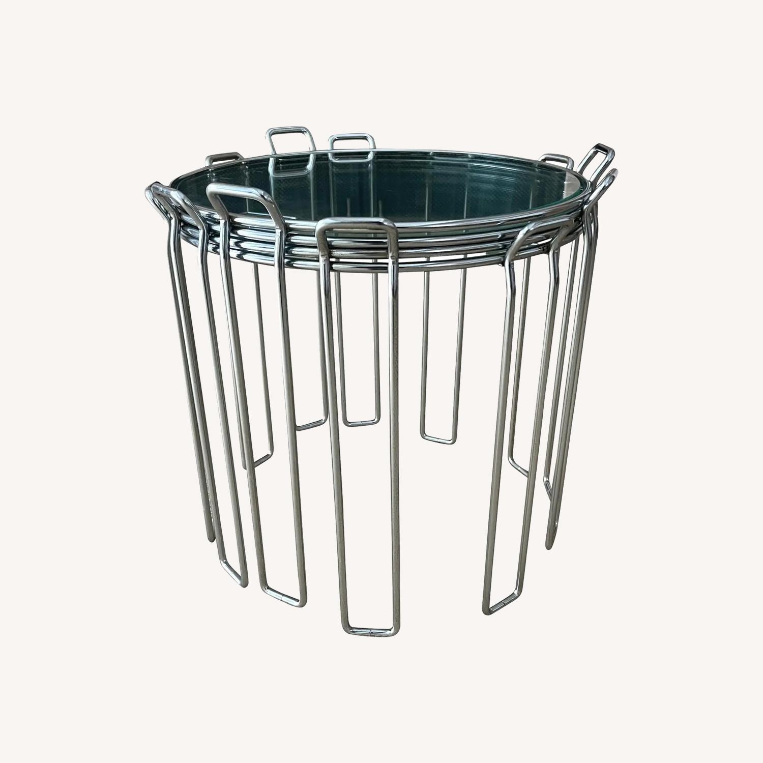 Seller's Notes:If you pine for some classic Italian mod decor, these tables might quench your thirst. Saporiti classic design, 4 chrome circular side tables with glass, sculptural and chic. Spread them out at your next gathering or keep them stacked for that pedestal effect. Timeless glam appeal. Each table measures 16.5ʺ × 16.5ʺ × 16ʺ high. Some scratching on one glass top but hard to notice, presents very well overall.