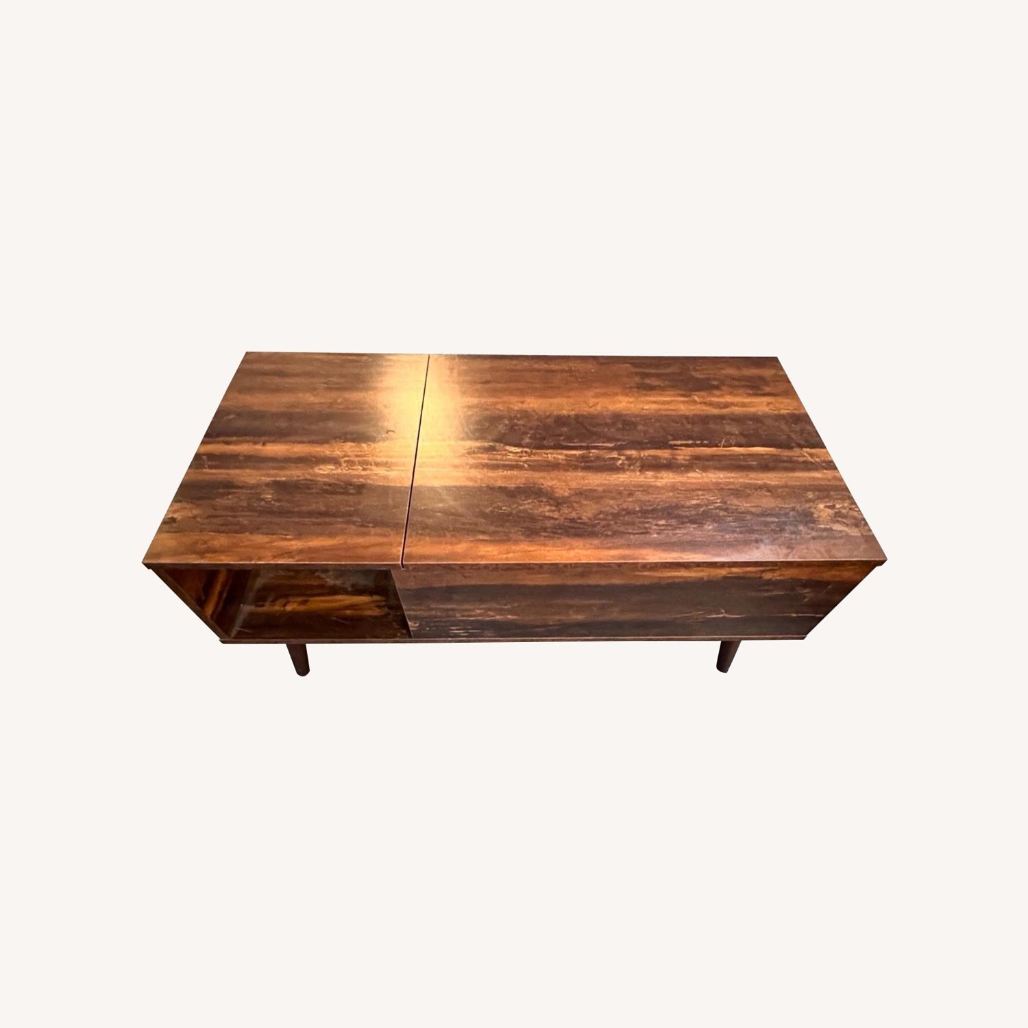 Seller's Notes:This modern lift top coffee table has an extending top that pulls up so you can eat, drink, or work off it comfortably. There's a large hidden compartment beneath the tabletop for storage, and the side drawer comes with a removable shelf for storing magazines or CDs. Normal height: 17.4". Height with top lifted: 23.7".