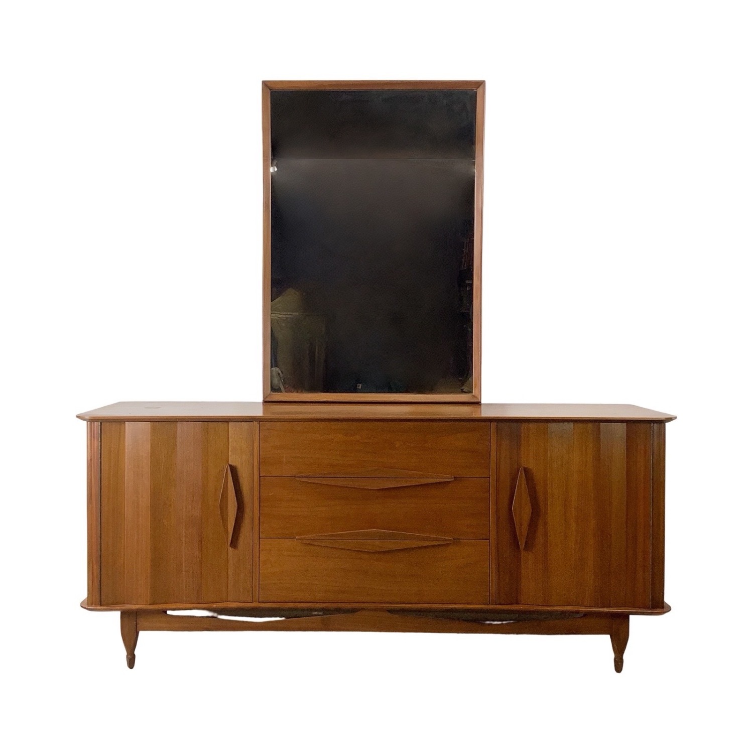 Seller's Notes:This vintage Mid-Century Modern dresser highlights the quiet sophistication that defines the period’s most enduring designs. Finished in walnut, the piece showcases natural wood grain and tonal variation, allowing material quality to play a central role in the overall aesthetic. The sculptural pulls—carved in a diamond motif—introduce a distinctive design element that sets the piece apart. These pulls create a sense of movement across the front of the case while remaining fully integrated into the clean geometry of the dresser. The storage arrangement is both practical and visually balanced, with drawers centered between cabinet doors to establish symmetry and flow. Supported by tapered legs, the dresser appears light and elevated while maintaining a strong architectural footprint. A matching framed mirror completes the set, reinforcing the original design intent and adding depth and presence. This piece embodies the Mid-Century Modern ideal of form meeting function through thoughtful design. Dimensions: 74w 21d 32h mirror 32w x46h Condition: age appropriate wear, vintage finish worn, scuffs/scratches, edge wear, discoloration, interior marks, veneer chips, see photos.