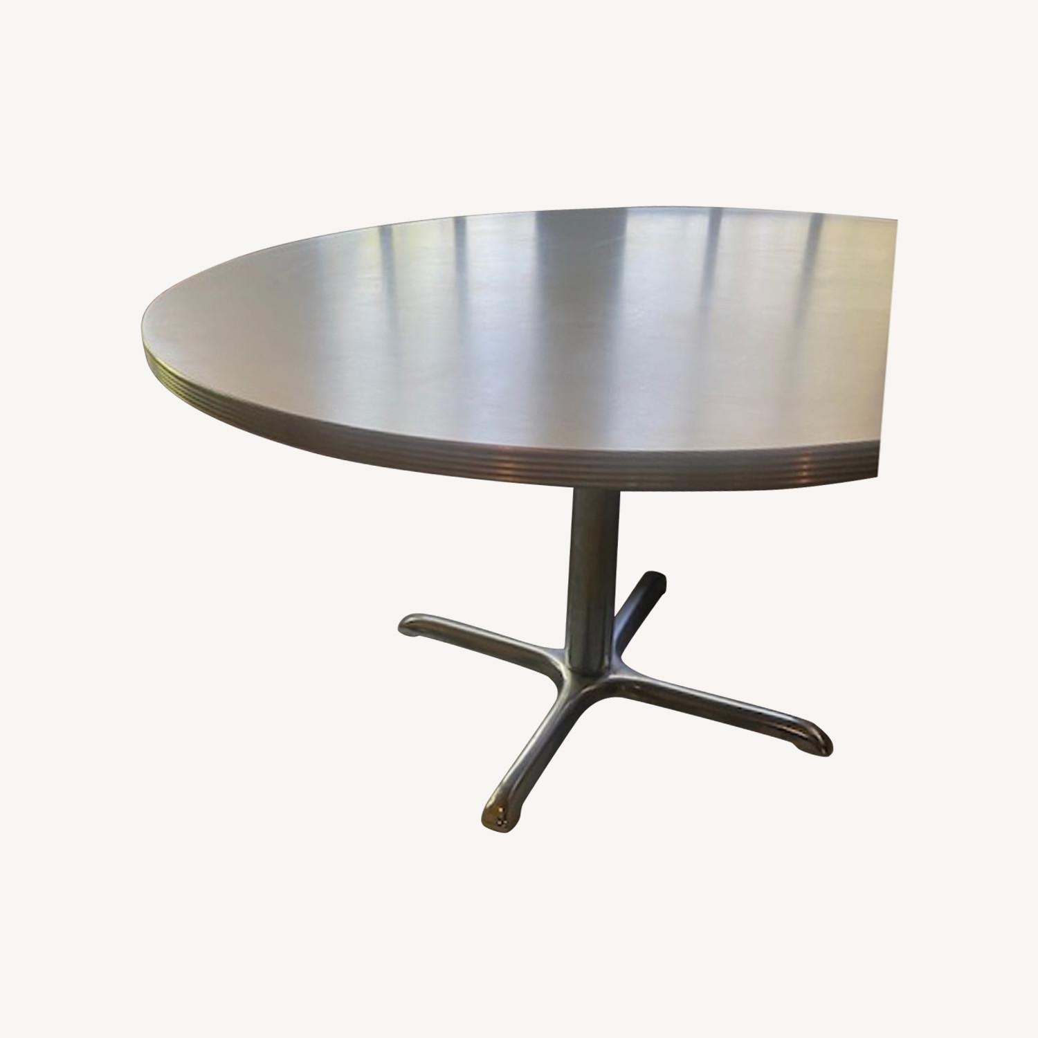 Seller's Notes:ACT FAST. ONLY AVAILABLE UNTIL 5/18.This bright white 47" round dinette table is ready for fun meals! Its sleek chrome pedestal and retro chrome-wrapped edge add a touch of diner charm. It's the perfect spot for sharing food and laughter in a fresh, lively space. Easy to clean white surface.