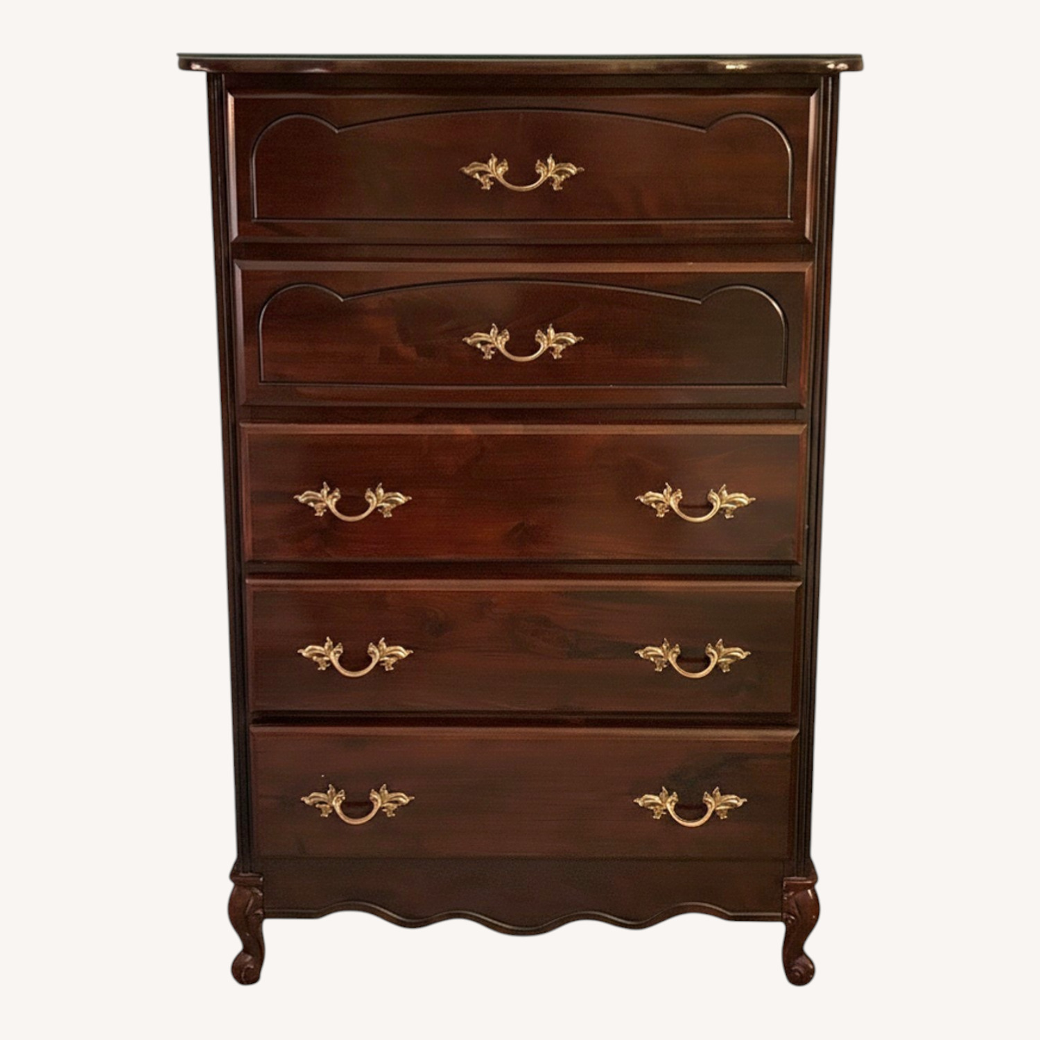Seller's Notes:5-drawer chest. Minor blemishes. All drawers and hardware are intact. Top surface of the chest has been protected by a custom glass, included in the sale. A matching 7-drawer dresser is also for sale.