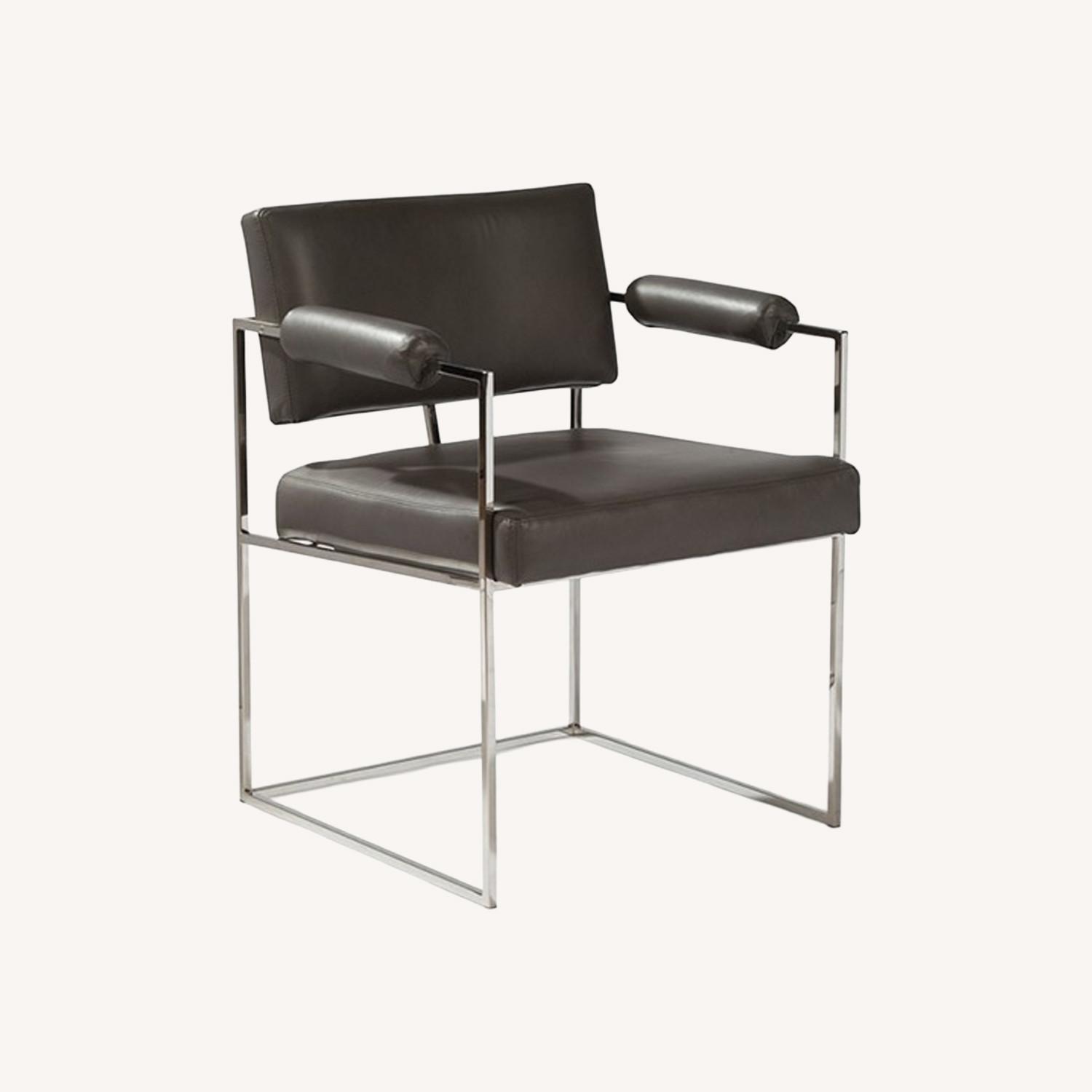 Seller's Notes:Gorgeous gray leather and steel chairs. Set of 4. Comfortable and stylish. They have hosted many dinner parties. Some scratches from cat claws on back and arms of some chairs.