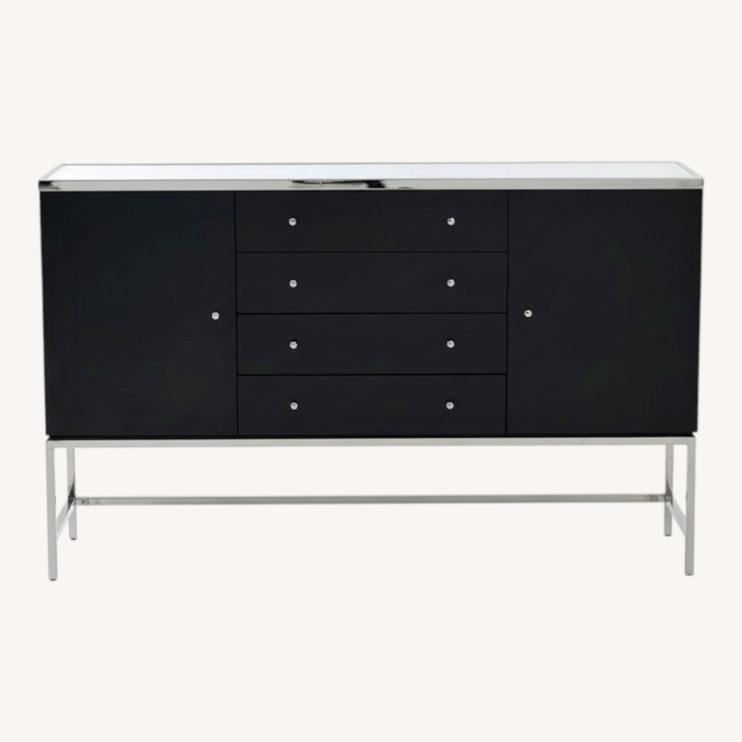 Seller's Notes:Our take on dressed-up modern, with architecturally inspired lines and a mix of materials. Two doors with adjustable shelves behind each and a row of four drawers in center. Ash veneers in rich Caviar stain. Polished stainless steel base. Drawer interiors painted black.