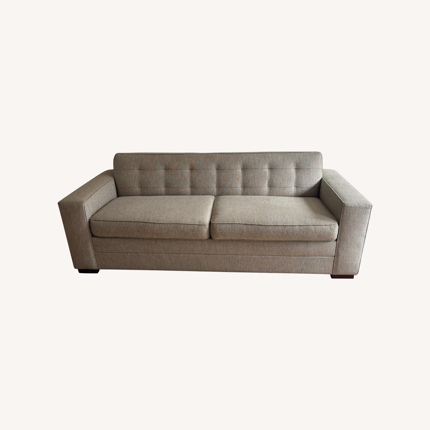 Seller's Notes:Gorgeous sofa by premium designer, manufactured in North Carolina in a beige-oatmeal fabric with subtle threads of blue, olive, and grey. It has a timeless, elegant look with clean contemporary lines and wide flat arms. Very comfortable and includes a brand-new thick sleeper mattress that's never been used!  Only tiny flaw: a small spot on the back of one arm (not visible in my arrangement because it faces the wall) where the fabric once frayed, but it's been neatly repaired with matching stitching so that it's really imperceptible (see photos).  Dimensions: 86"W x 36"D x 34"H Arm height: 25" | Seat height: 19"