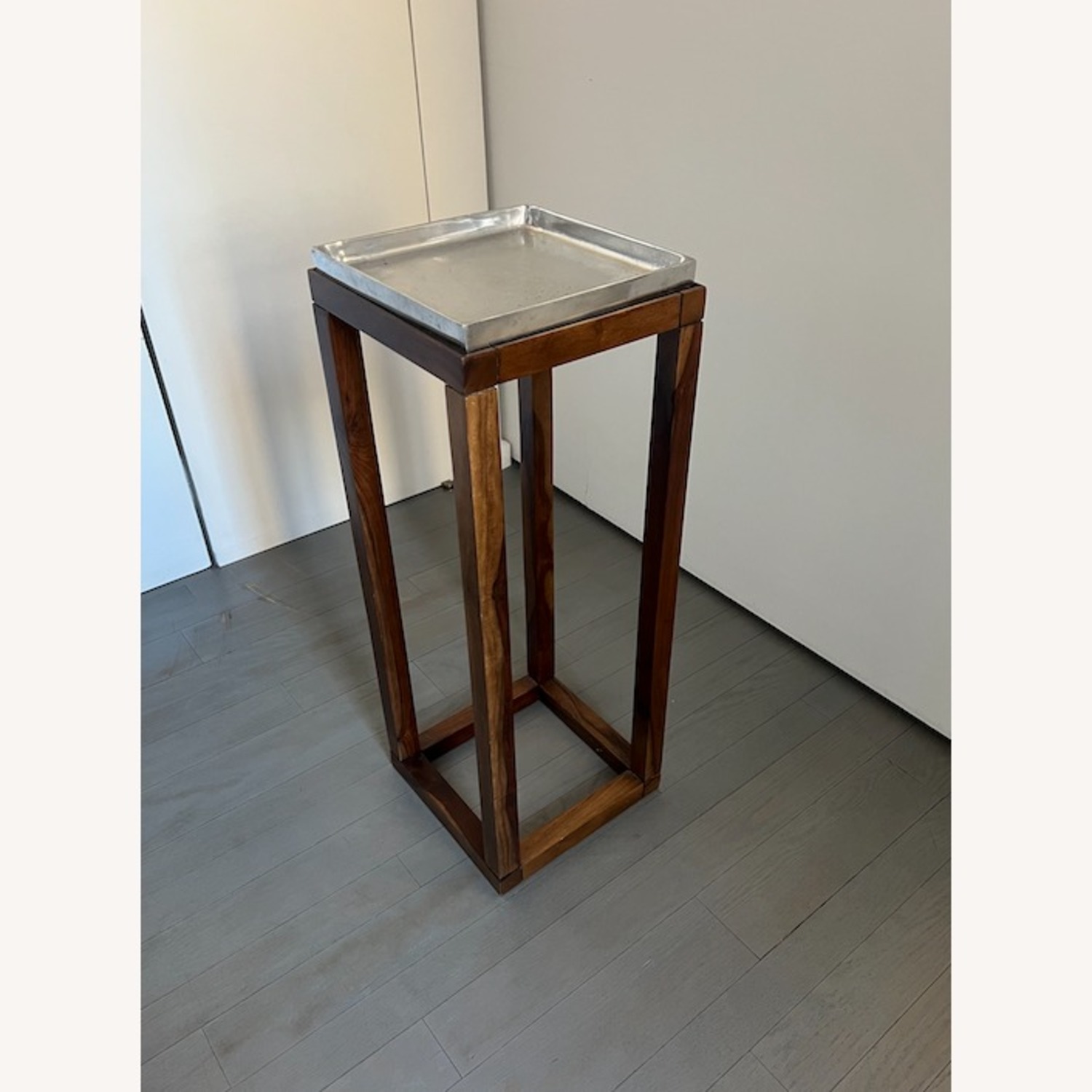 Seller's Notes:Beautiful modern wood and metal accent table. Can be used as a drink table or plant stand as pictured. Wooden Base: Solid walnut built using traditional woodworking joinery. Finished with a blend of mineral oil and beeswax for a smooth and buttery feel. Metal Top: Chrome Finish, Solid Metal. Metal top is removable. • Width: 10 " • Depth: 10 " • Height: 27 "