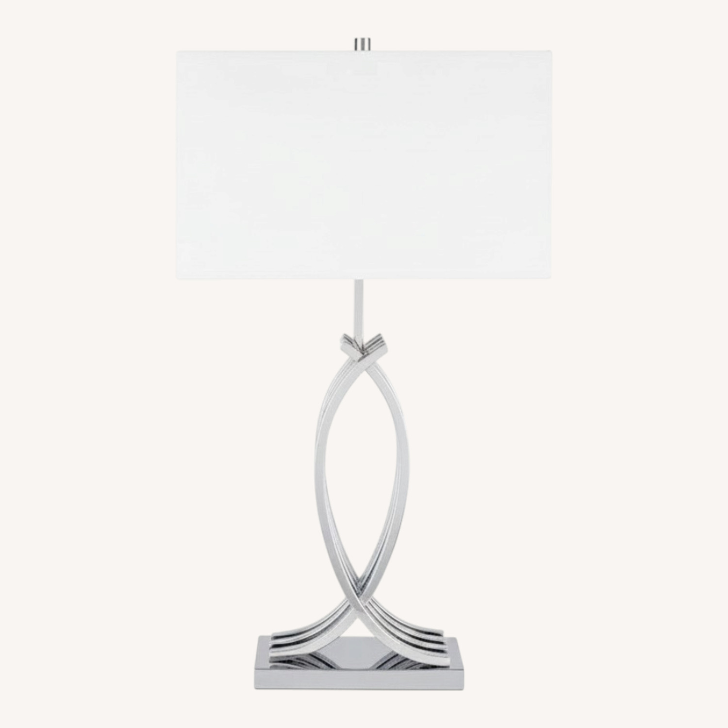 Seller's Notes:Set of 2 modern table lamps featuring a sleek brushed nickel base with a sculptural loop design and clean white rectangular shades.