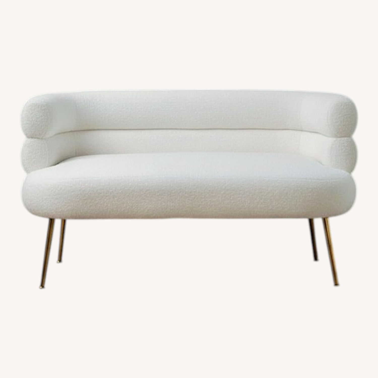 Seller's Notes:Beautiful cream bouclé loveseat with elegant brass legs. This piece has a modern Parisian aesthetic and is perfect for apartments, studios, or small living rooms.