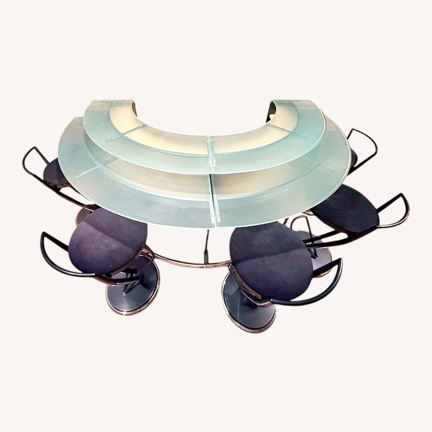 Seller's Notes:"Martini" Free Standing Bar Designed by Dario Antonioni for the Elite Modern Mfg. Co. + 5 Matching Swivel Stools Elevate your entertaining space with this modern curved bar featuring a sculptural silhouette and tiered frosted glass surfaces. A standout addition for a finished basement, lounge, or dedicated bar area. Crafted from a sophisticated mix of metal, wood, and glass resulting in a uniquely distinctive look that is clean, refined, and timeless. This piece blends well with modern, transitional, or industrial interiors and creates an instant focal point for hosting. Features: - Dual-tier frosted tempered glass top - Clean, contemporary curved design - Black base with chrome detailing - Polished chrome footrest - Hidden shelves and stemware racks - Includes 5 coordinating swivel bar stools - Compact footprint while still comfortably seating five Condition: Excellent, like new condition. Minimally used. Structurally very solid. Bar purchased at retail for $5,098, and stools over $1,000. Dimensions: 69.5” W x 36” D x 46.5” H Pickup only (heavy piece). Will require 2 people to move