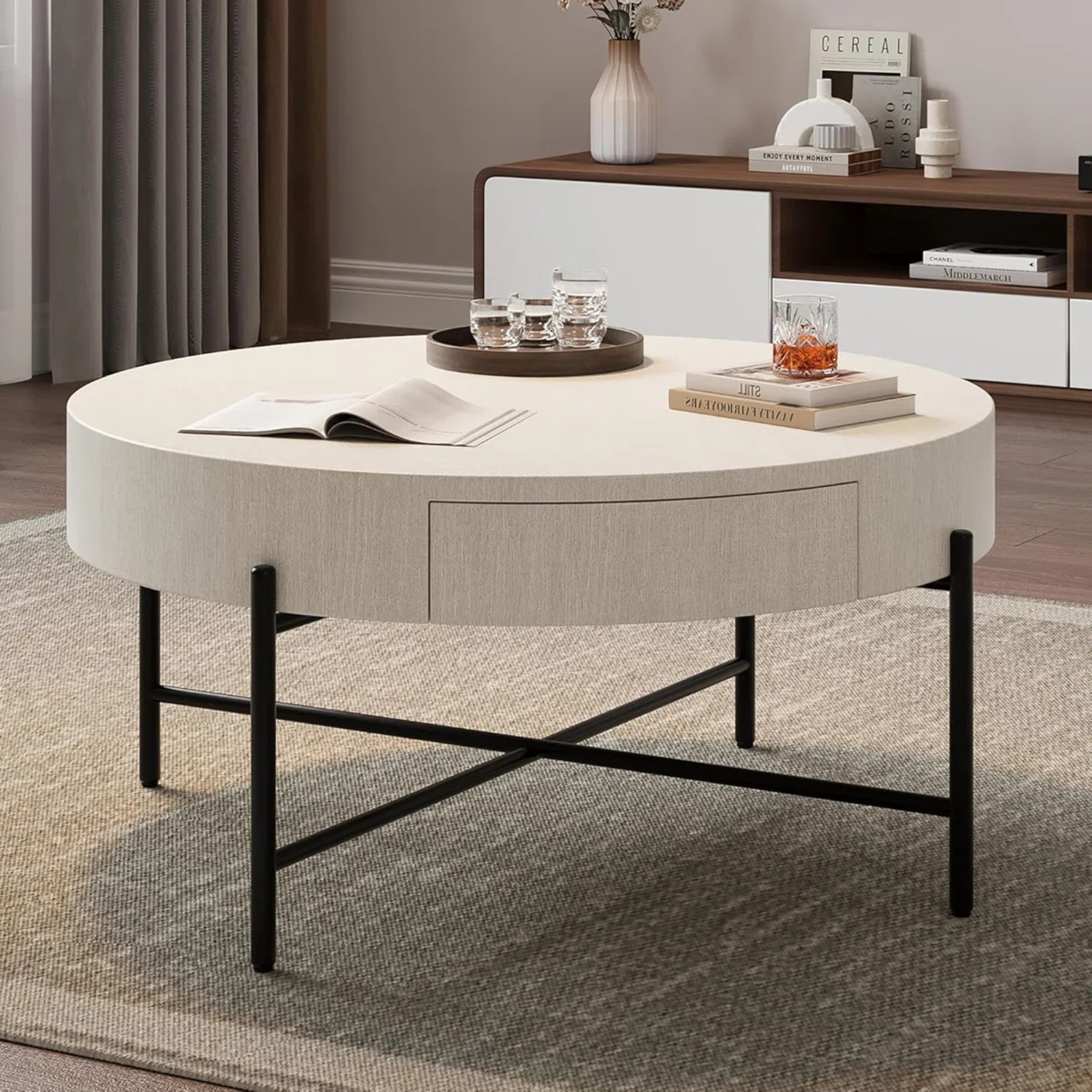Seller's Notes:Coffee Table with Two Drawers: This wood coffee table features a wide tabletop and 2 drawers to provide ample display and storage space, a 31.9'' wide tabletop is ideal for displaying decorative items or storing magazines, snacks, coffee, cocktails, or books and keeps items within reach, two drawers offer extra private and dust-proof space to keep everything in order and accessible, which makes your room tidy. Built-to-Last Material: This round coffee table is constructed of high-density premium MDF boards that are waterproof and wear-resistant, combine with metal legs to ensure a sturdy and stable structure for long-term use, which can hold up to 150 pounds and can easily accommodate your items, each leg is equipped with non-slip foot pads to enhance stability and prevent the floor from scratching.