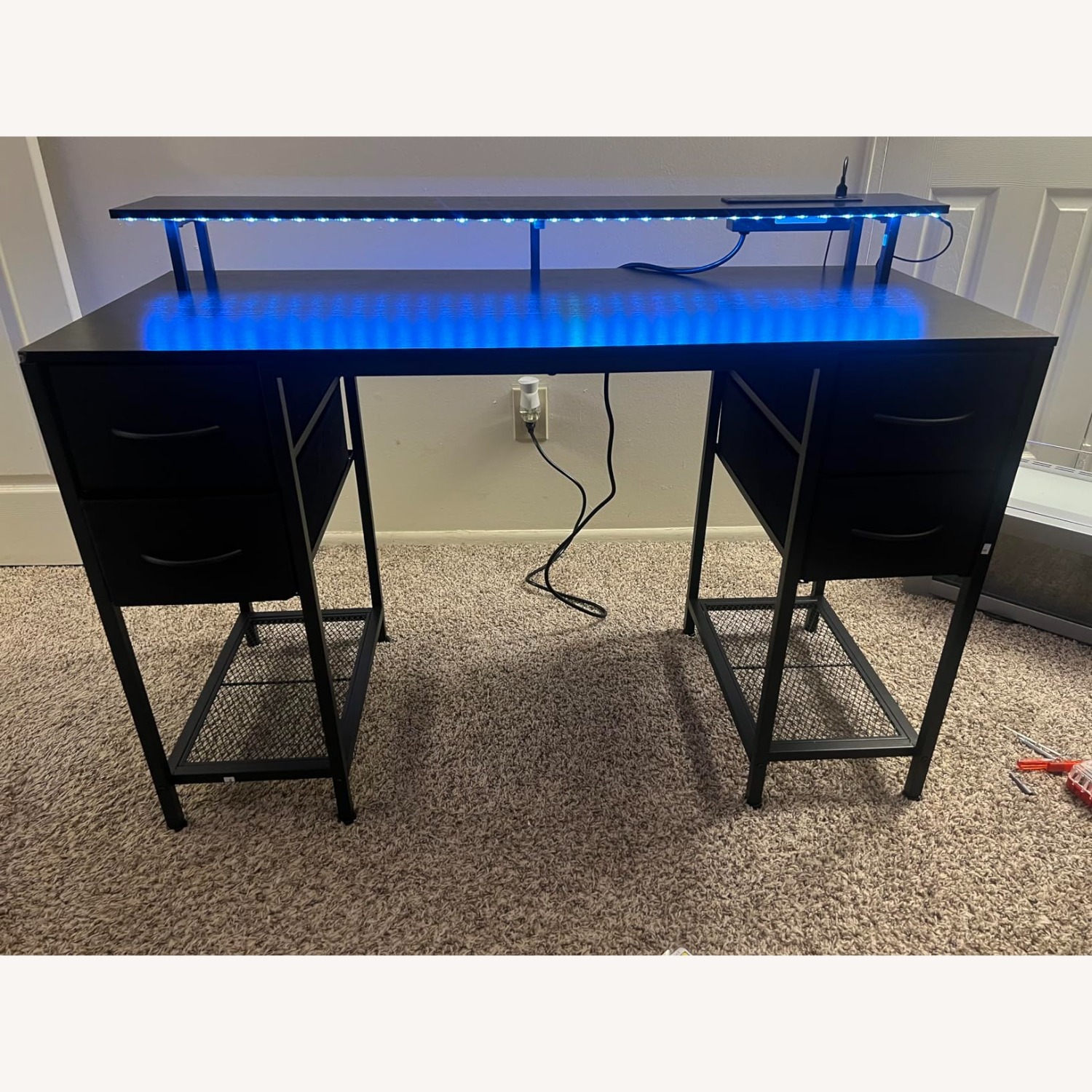 Seller's Notes:Dimensions: 47.3”W x 19.7”D x 29.5”H Color: Rustic Brown Style: Modern / Minimal This desk works great for studying, working from home, gaming, or general everyday use. Selling only because I upgraded my setup. My gaming/work desk in excellent, like-new condition. Mine is the Rustic Brown top with Black drawers version, and it still looks almost exactly the way it did the day I bought it. No wobbling, no scratches, nothing loose — just a solid, clean desk ready for someone else to use. The desk has a strong metal frame, a durable engineered-wood top, and 4 drawers that you can arrange on either side depending on your setup. It also has a raised shelf that works great for a monitor or camera, keeping the main surface more open. It comes with built-in power outlets and USB ports, so charging your laptop, phone, or accessories is super convenient. It also includes LED strip lighting, which gives it a nice gaming vibe if you want to use it. This desk has served me well for a year, mostly for studying and light work, and I took good care of it the entire time. The condition is genuinely top notch — it still looks and feels brand new. Perfect for gaming, studying, office work, or a clean home workstation.