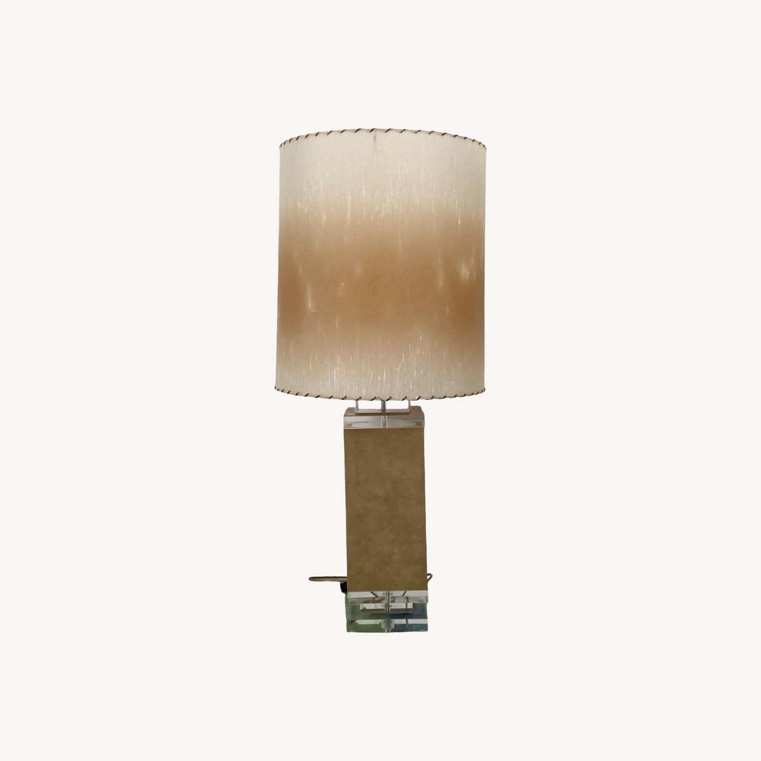 Seller's Notes:This modernist vintage table lamp is defined by its clean geometry and thoughtful use of materials. The tall rectangular column is wrapped in a suede-textured finish that adds warmth and softness to the otherwise structured form. Lucite accents at the top and base introduce contrast and clarity, framing the column while visually lifting it from the surface below. This combination of solid and transparent elements creates a balanced, sculptural effect. The lamp is finished with a cylindrical parchment-style shade that gently diffuses light. Subtle stitched edging provides understated detail while maintaining the lamp’s modern character. Designed with generous scale, this lamp works well as a statement piece on a console, credenza, or side table. Its presence feels intentional without overwhelming surrounding décor. The design aligns comfortably with vintage modern, transitional, and contemporary interiors, offering versatility alongside visual interest. A strong example of modernist lighting that prioritizes proportion, material, and form. Dimensions: 15w 15d 35.5h w/shade 6w 6d 33h Condition: age appropriate wear, vintage finish worn, scuffs/scratches, edge wear, discoloration, wear, cracking to shade, see photos,
