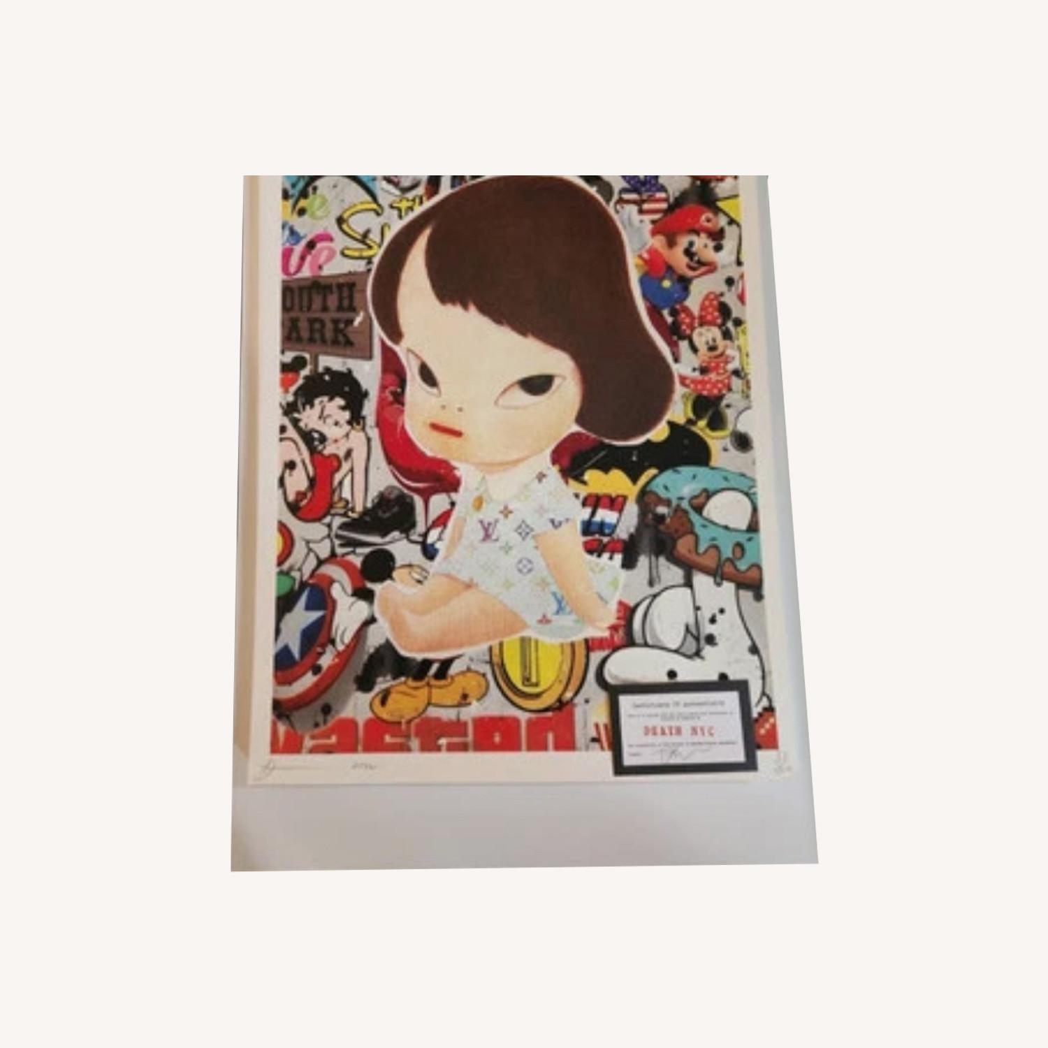 Seller's Notes:This is a rare art piece only one of 100 signed Nara, Andy Earhol piece. Very large , authentic. Great centerpiece fills the room striking colors. Banksy , this is with three artist Nara from Japan , banks and Andy Warhol stamped piece