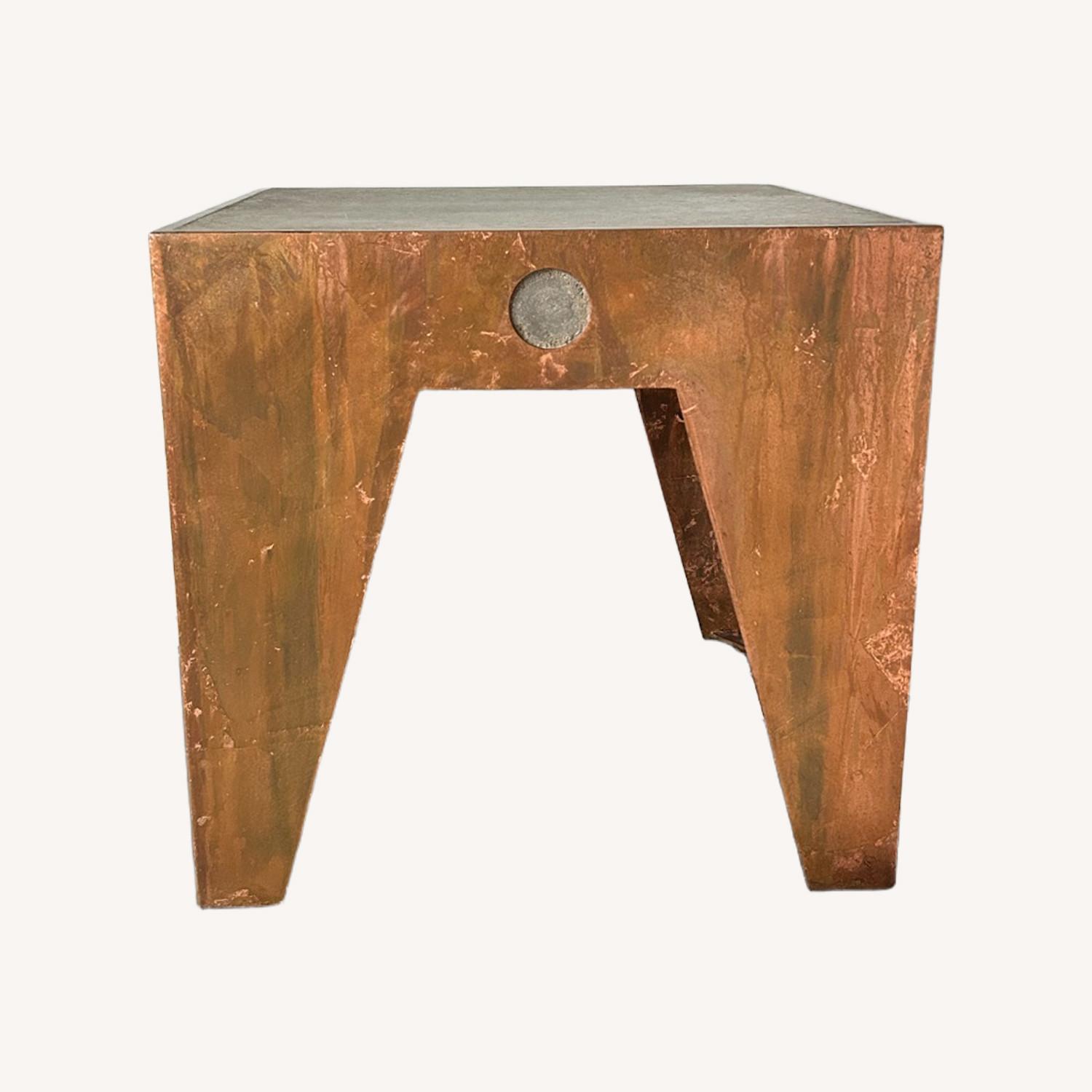 Seller's Notes:Custom brutalist side table crafted from hand-formed copper with natural patina and a solid poured concrete top. Architectural silhouette with sculptural negative space. One-of-a-kind statement piece.