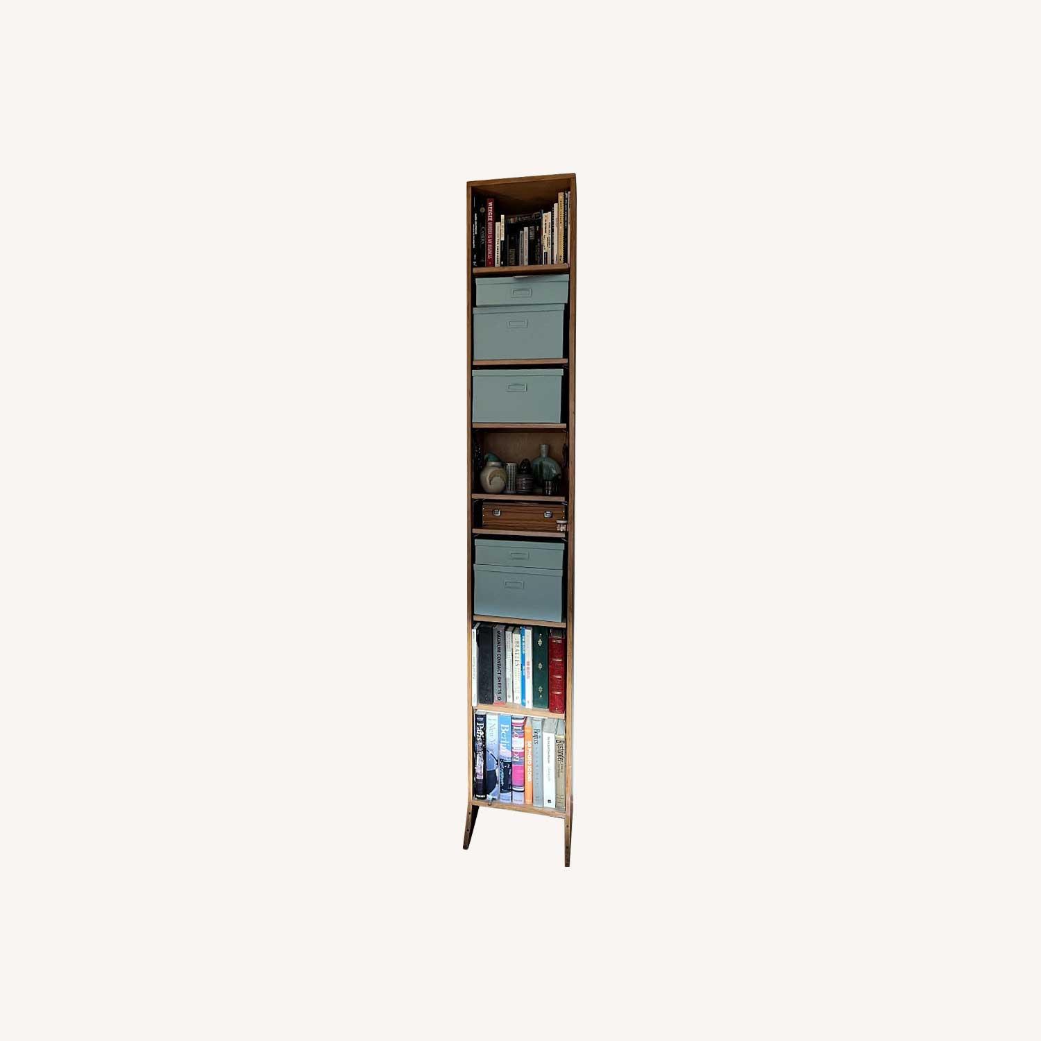 Seller's Notes:Natural colored wooden bookcase with 8 adjustable shelves. Good condition; minor wear and tear. All hardware included for shelves. 101 inches tall; 16.5 inches wide; 11.25 inches deep. Smoke-free and pet-free home. We're moving and no longer need it.