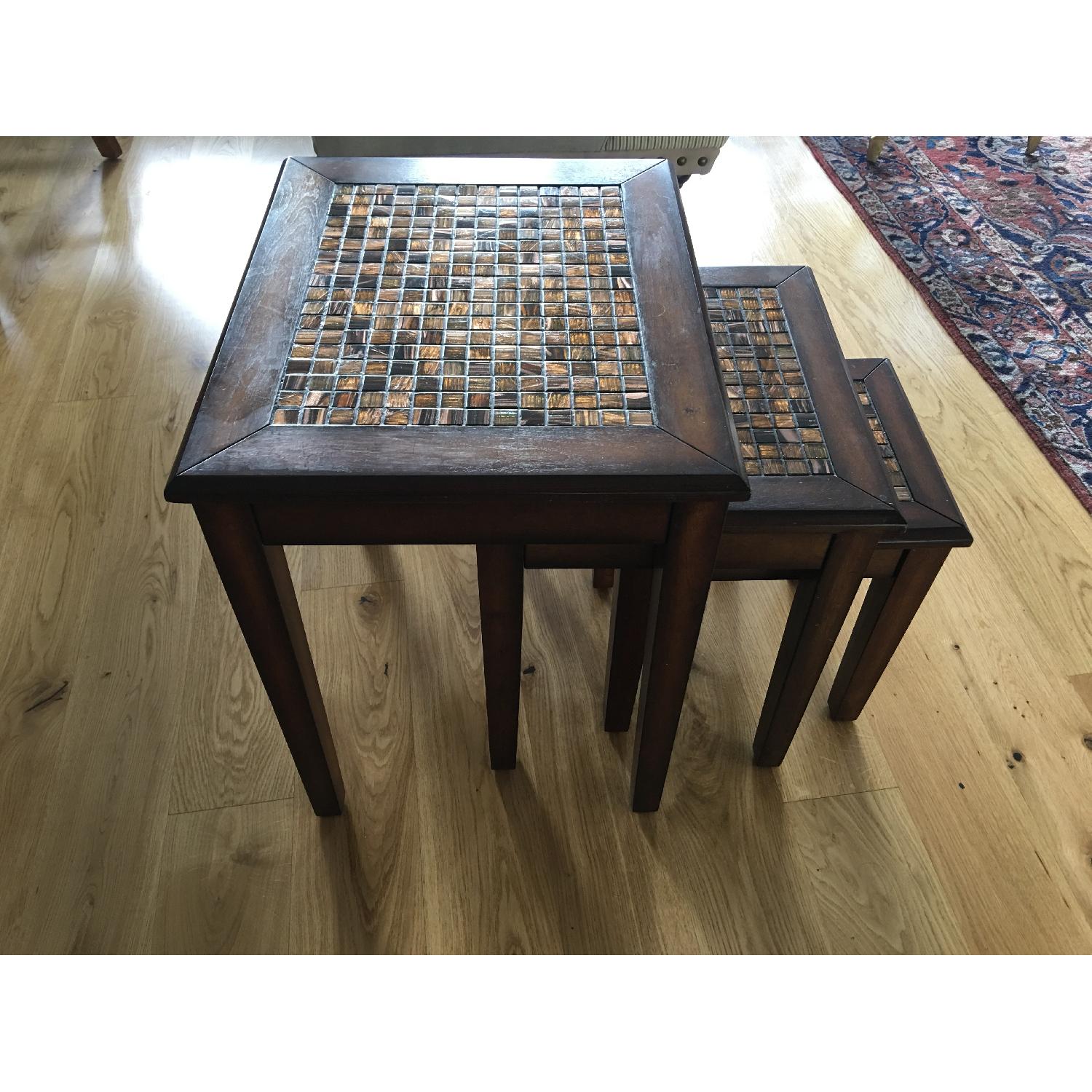 Seller's Notes:3 gorgeous nesting tables with mosaic tiles Large Nesting Table L: 21" x W: 17" x H: 22" Medium Nesting Table L: 16" x W: 16" x H: 19" Small Nesting Table L: 12" x W: 14" x H: 15"