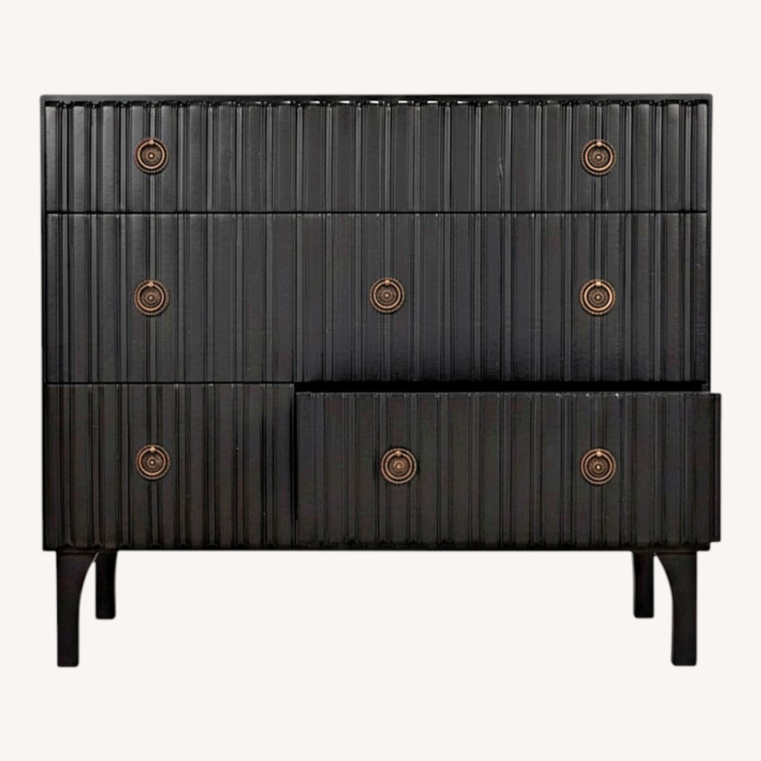 Seller's Notes:A sculptural statement piece from Noir Furniture. This genuine Daryl Dresser (Item #A07600011) is handcrafted from solid mahogany with a stunning hand-rubbed black finish. The standout feature is the hand-carved vertical fluting across the three spacious drawers, accented by the original antiqued brass medallion ring pulls. Its minimalist, mitered "picture frame" silhouette and tapered legs make it a perfect fit for Modern, Transitional, or Art Deco interiors. • Retail Price: Over $2,700 new.