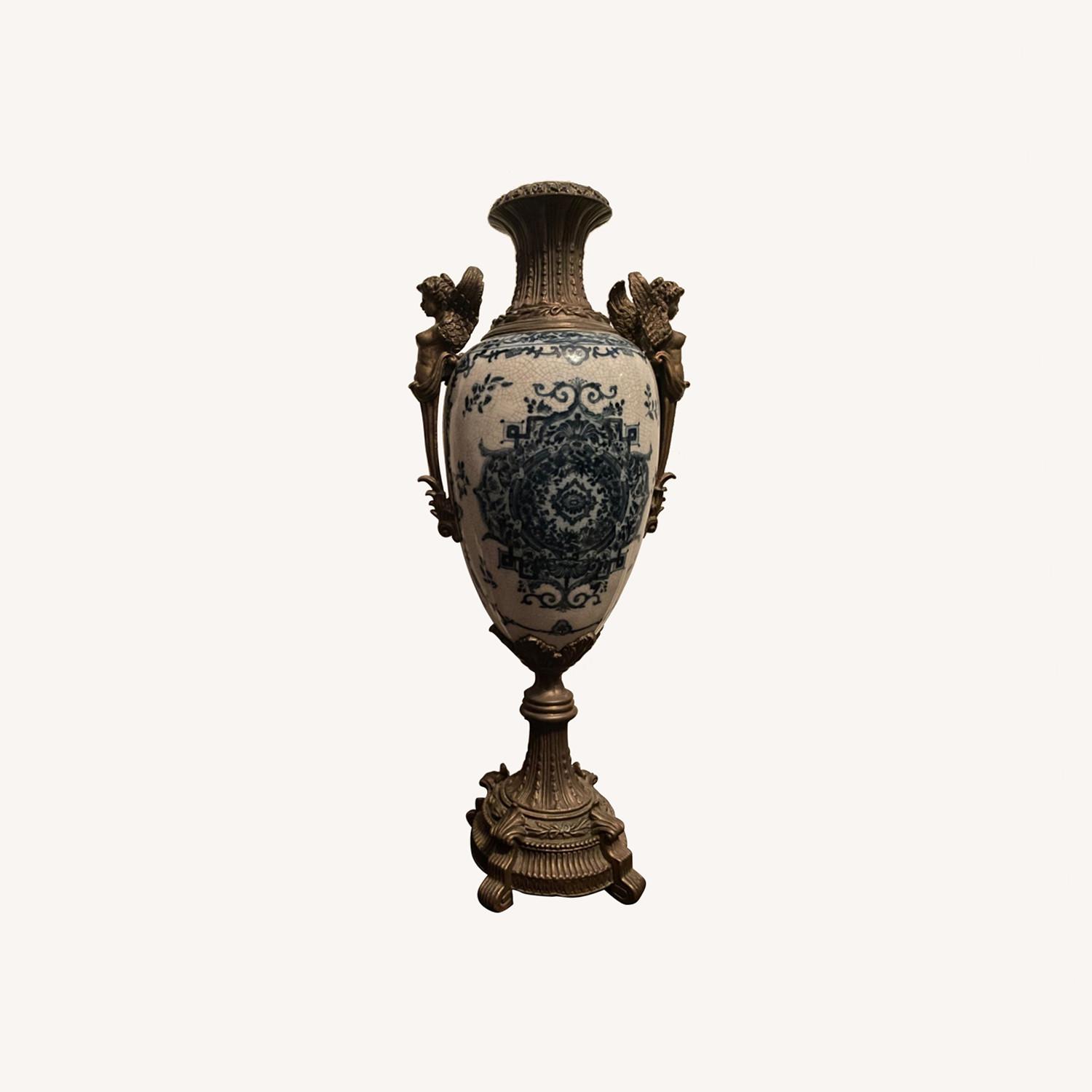 Seller's Notes:These antique-style decorative vases feature a distinctive blue and white ceramic body with intricate floral and geometric patterns, reminiscent of Delftware or Asian porcelain. They are embellished with ornate mounts, including a fluted base, decorative handles shaped like winged cherubs, and a detailed rim. The ceramic shows a crackle glaze finish, adding to their vintage appeal. These pieces serve as a striking decorative accent, suitable for various interior styles.