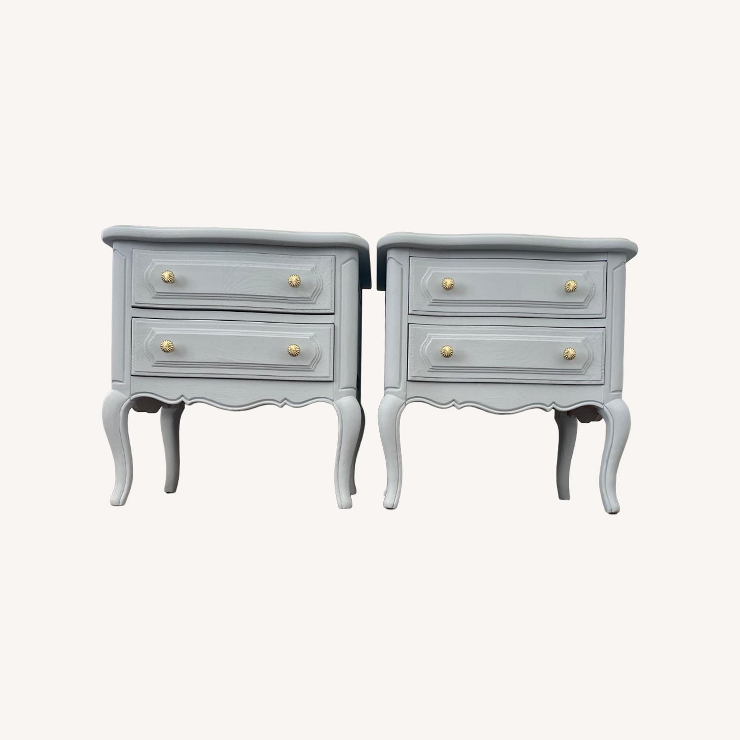 Seller's Notes:professionally refinished in a soft blue-gray with elegant brass hardware. These feature classic cabriole legs, curved aprons, and timeless detailing—perfect for a romantic, cottage, or French provincial bedroom. Styled beautifully on each side of the bed and sized just right for lamps, books, and bedside essentials. Solid, sturdy, and full of character—ready to elevate your space. Details: • Sold as a matching pair • Smooth, durable painted finish • Brass knobs for a warm, vintage touch • Two spacious drawers per nightstand • Clean, smoke-free home Perfect for a French country, traditional, or transitional interior.