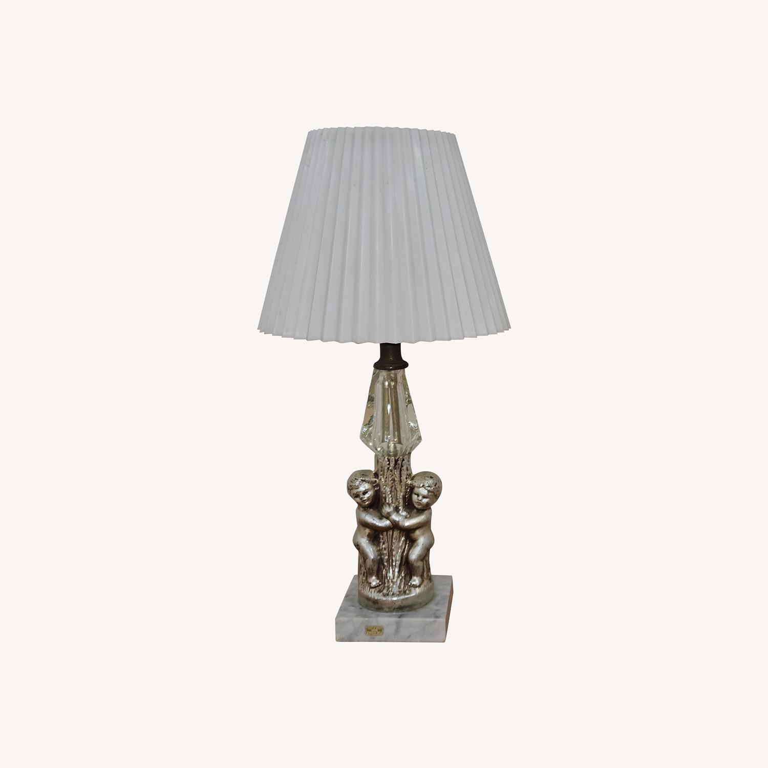 Seller's Notes:Presenting a pair of vintage cherub table lamps exhibiting Hollywood Regency and Neoclassical stylistic elements. The bases are adorned with intricately crafted cherub figures in a silver-tone finish embracing a central column. Above each cherub, clear crystal accents add refined detail. The lamps are mounted on square fine marble bases, made in Italy, and topped with solid white hard plastic lampshades for a clean, elegant appearance. The felt-covered base protects tabletop surfaces. Comparable vintage cherub lamps can be traced to various decades, notably the 1950s and 1960s. Each lamp accommodates a standard E-26 Edison medium screw base "A" style bulb (not included). The modern rigid plastic shade features a clip-on fitter, is easy to clean, and has a cream finish. Angled pleats diffuse the light for a subdued and warm illumination, producing a cozy ambiance. Equipped with a Triboro plug, Leviton Lamp Holder and made in the USA. These lamps are lightly used and may display some minor signs of wear but are in perfect working condition. Dimensions: • Height: 16" to top of shade • Base dimensions: 3.5" square • Shade diameter: 4.5" (top), 7.5" (bottom) • Shade height: 6"
