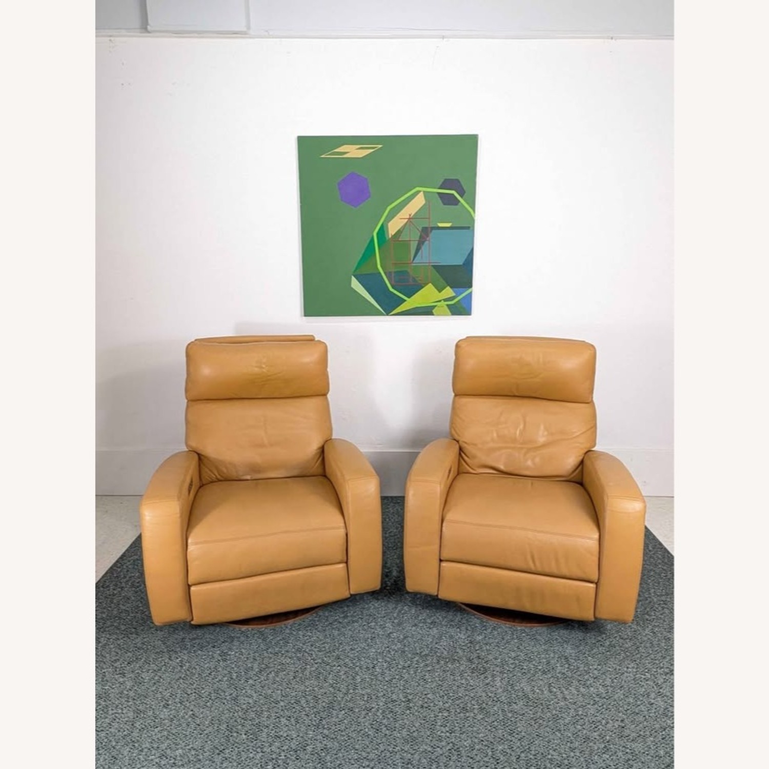 Seller's Notes:Beautiful Pair of Powered Leather Recliners by American Leather Amazingly plush set of Dexter Collection, powered leather recliners by the American Leather Co. They feature buttery soft, camel colored, top grain leather with push button controls, rechargeable battery packs so they don't have to be plugged in all the time, USB ports to charge electronics & solid wood swivel bases. Made in 🇺🇸 USA!