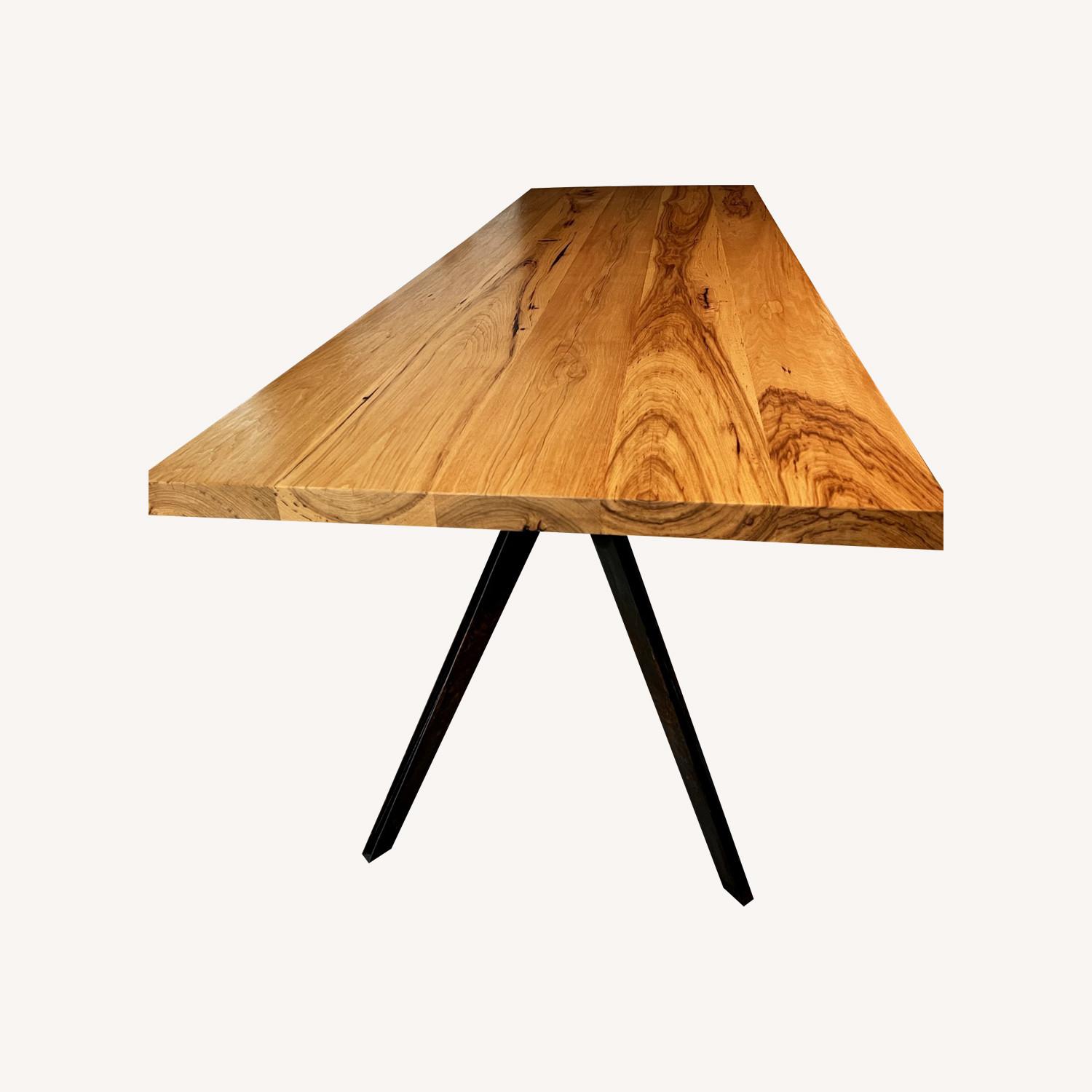 Seller's Notes:Custom dining table by Mockingbird Made, in gorgeous pecan wood with finished edges and metal base. This beautiful piece adds a sleek modern look to any dining room, and is well suited with a variety of different chair types. The table is in excellent condition, with a barely visible scratch or two. Chairs pictured may also be available for purchase upon request.