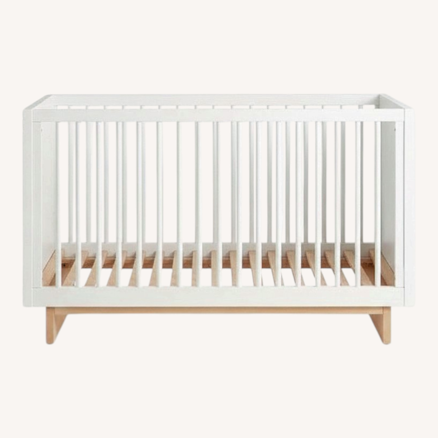 Crib is finished in Simply White with Natural Oak base.