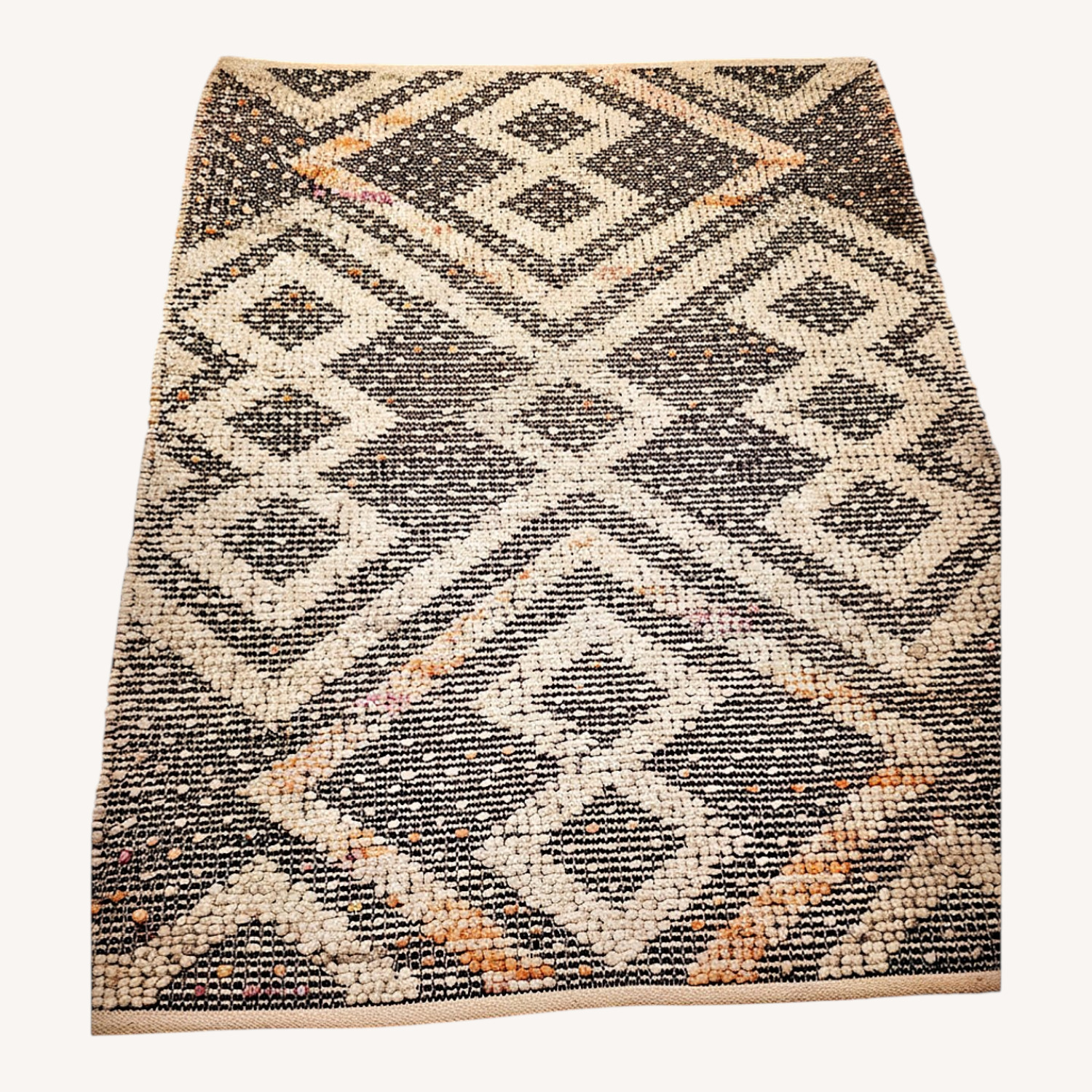 Seller's Notes:Textured accent rug with a distinctly handcrafted feel. It features a geometric design blending cream and black as the primary contrast, with subtle threads of orange and pink woven throughout.