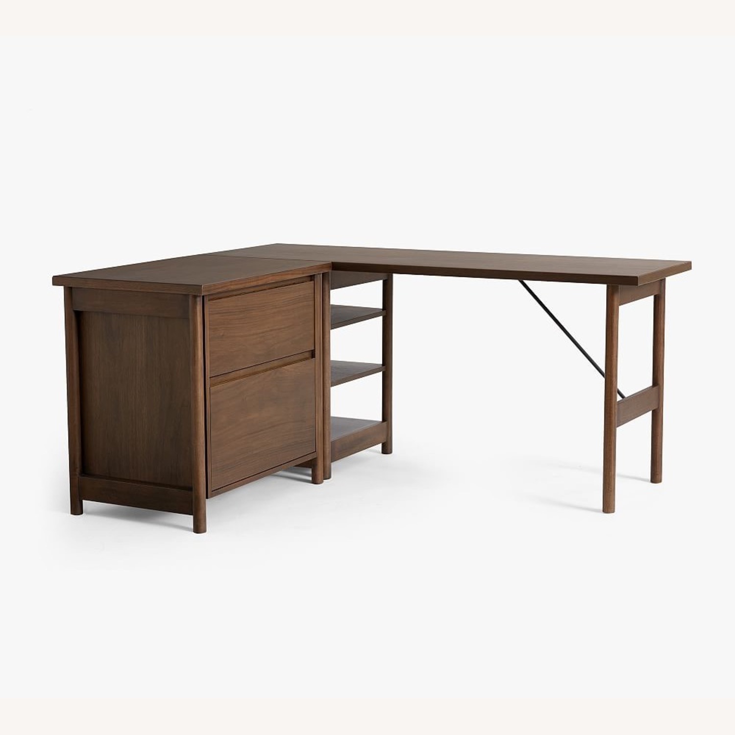Desk features 1 open bottom fixed shelf and 2 adjustable top shelves.