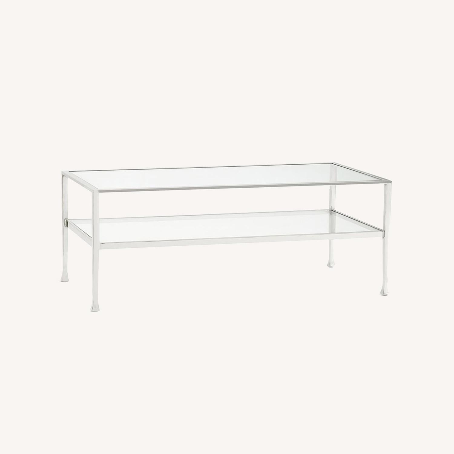 Seller's Notes:Modern 2-tier glass coffee table with a metal frame. No cracks or chips, just a few minor scratches on metal. Stock photos from PB website are same table with different finish.