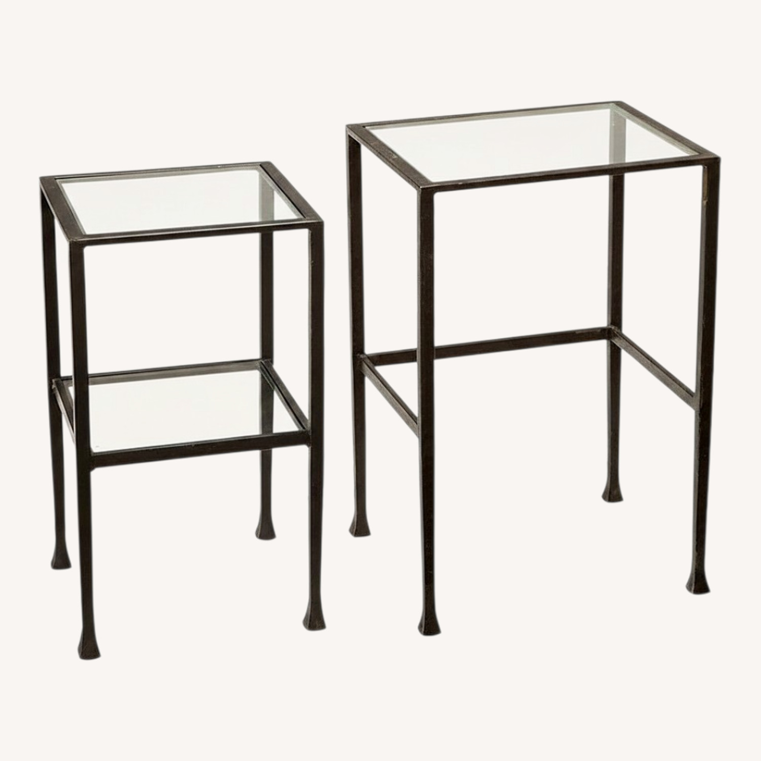 Seller's Notes:Construction Crafted of iron with a tempered glass top. Base features a powder-coated black or polished nickel finish. Set of 2 tables. Adjustable levelers provide stability on uneven surfaces. Contract Grade: Thoughtfully designed and expertly engineered to meet rigorous testing standards and best practices from select ANSI/BIFMA testing protocols.