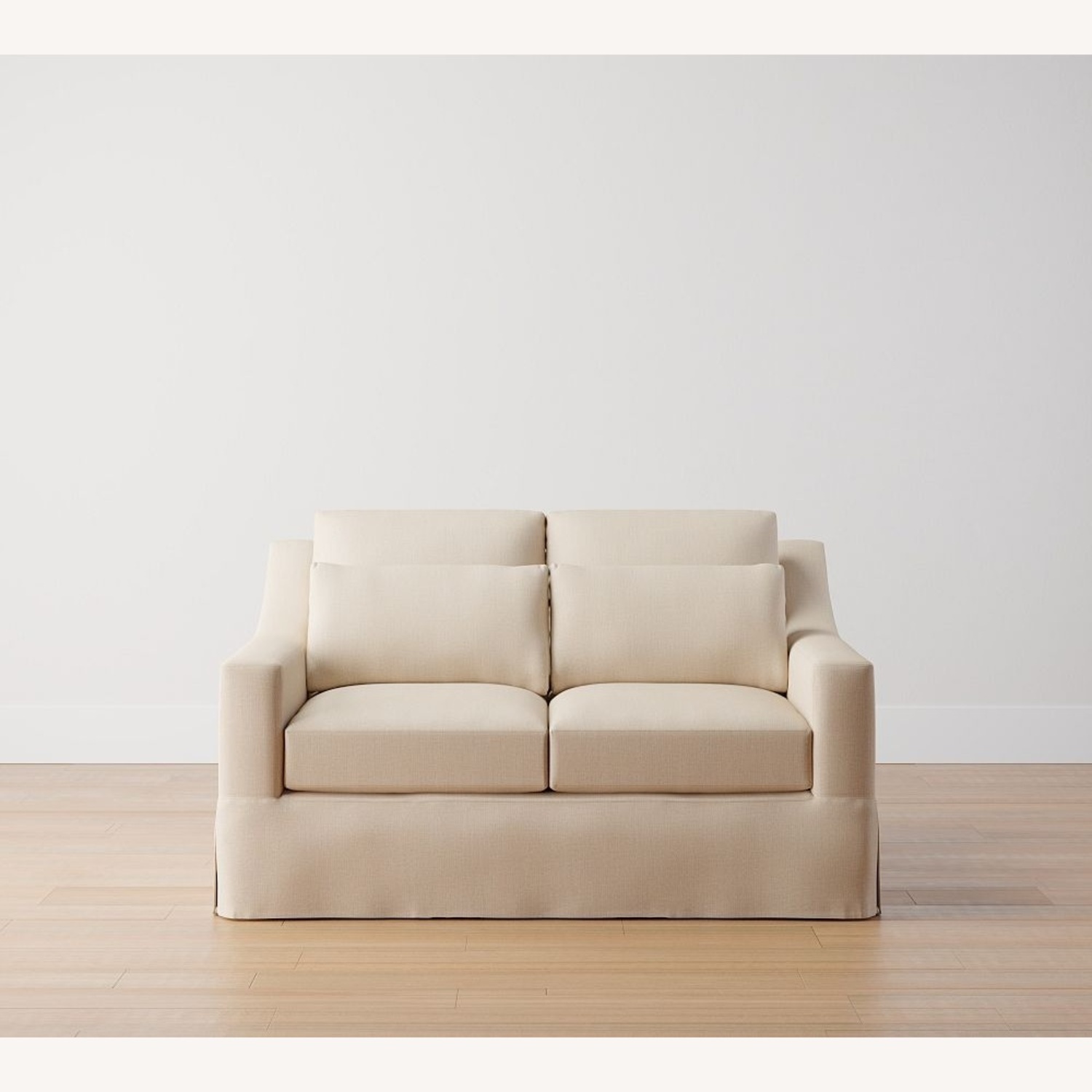 Seller's Notes:White canvas slipcovered loveseat. Only about two years old. Selling because I no longer have space due to new apartment layout. Beautiful piece. Some stains but slipcover can be removed to launder. Coastal vibes!