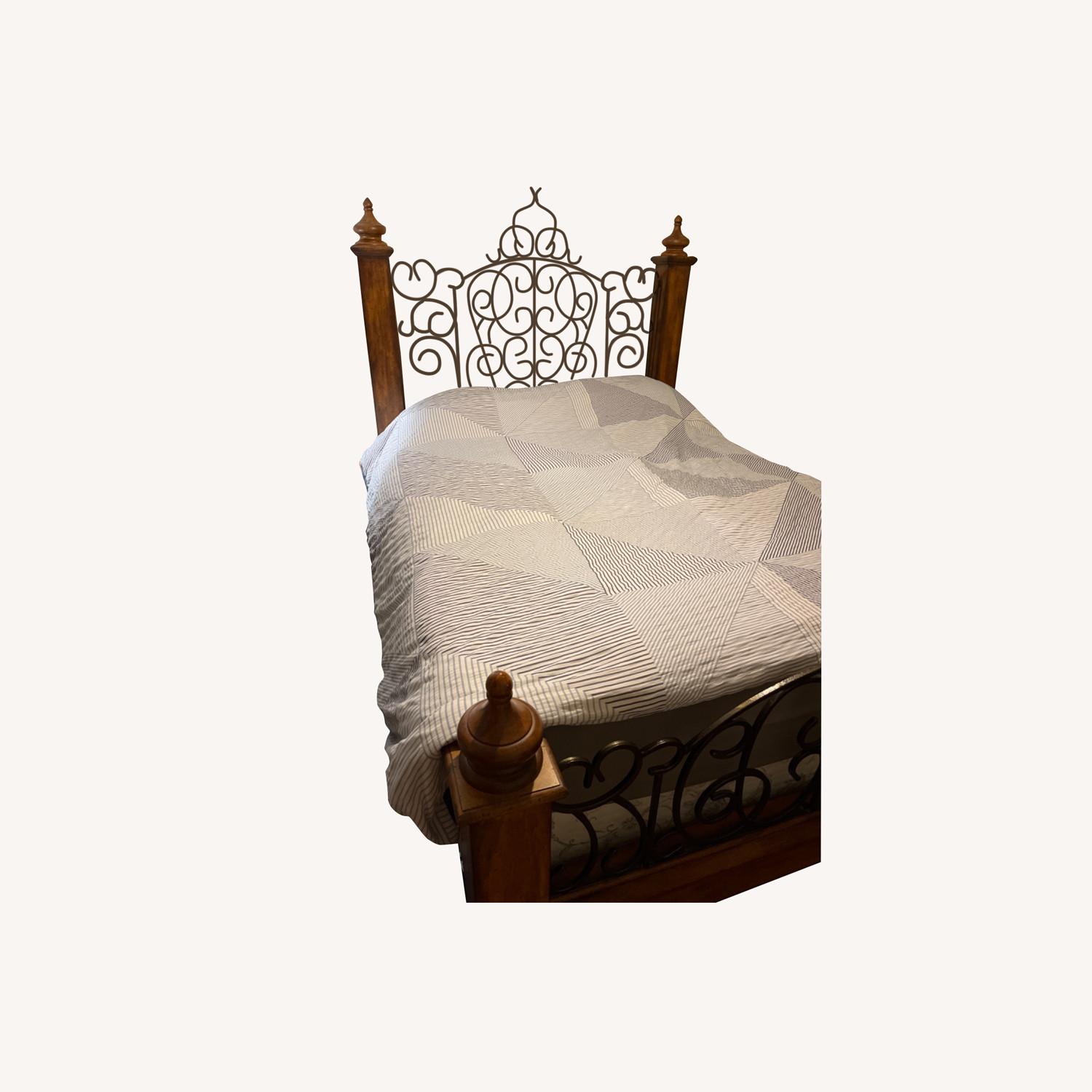 Seller's Notes:Solid, study queen bed frame with footboard and headboard, wood with decorative iron accents. 15 years old. From a home with a hypoallergenic mini schnauzer, no other pets, non smoking home. Located in Forest Hills NYC