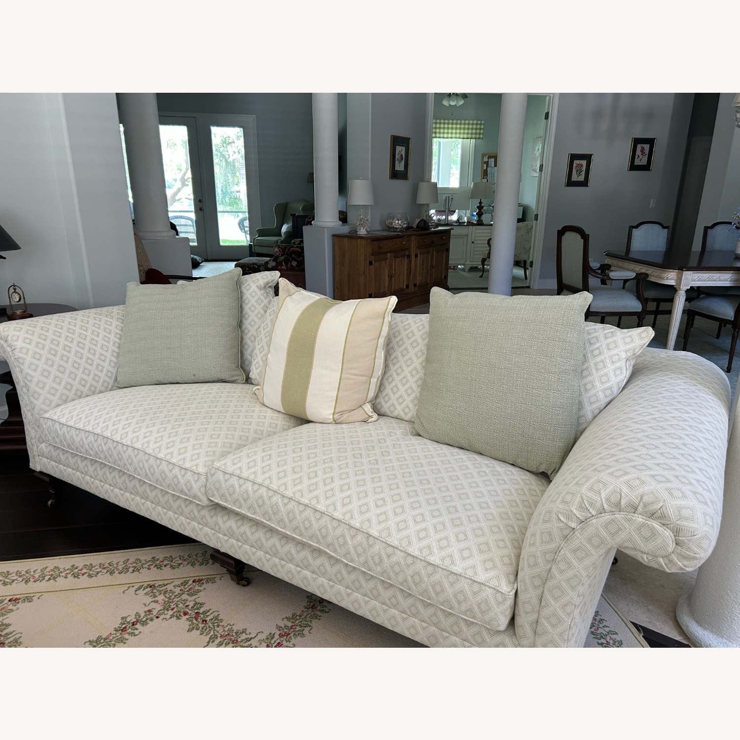 Seller's Notes:This is a rare find! An amazing Ralph Lauren custom-made sofa that was used in a formal living room that was rarely used. No stains, rips, or tears - minor scratches on the feet that are barely noticeable. The white fabric has a light green pattern and looks elegant and timeless in any home.