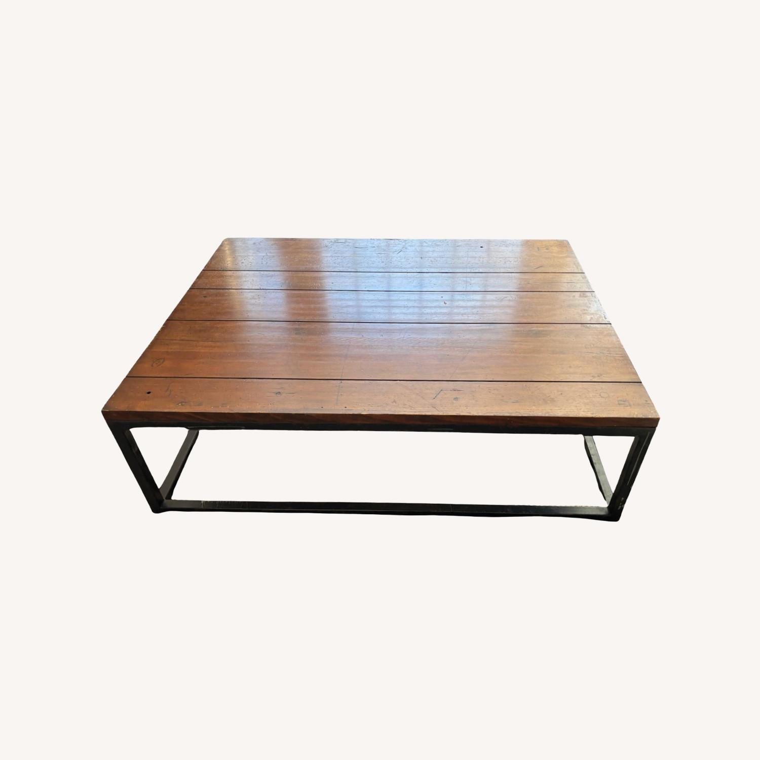 Seller's Notes:Ralph Lauren wood coffee table with black metal base. Significant, large size: 54 inches long x 41.75 inches wide x 16 inches high. Perfect for a living room or family room coffee table. Distressed wood look with significant chipping / scratches (see photos).