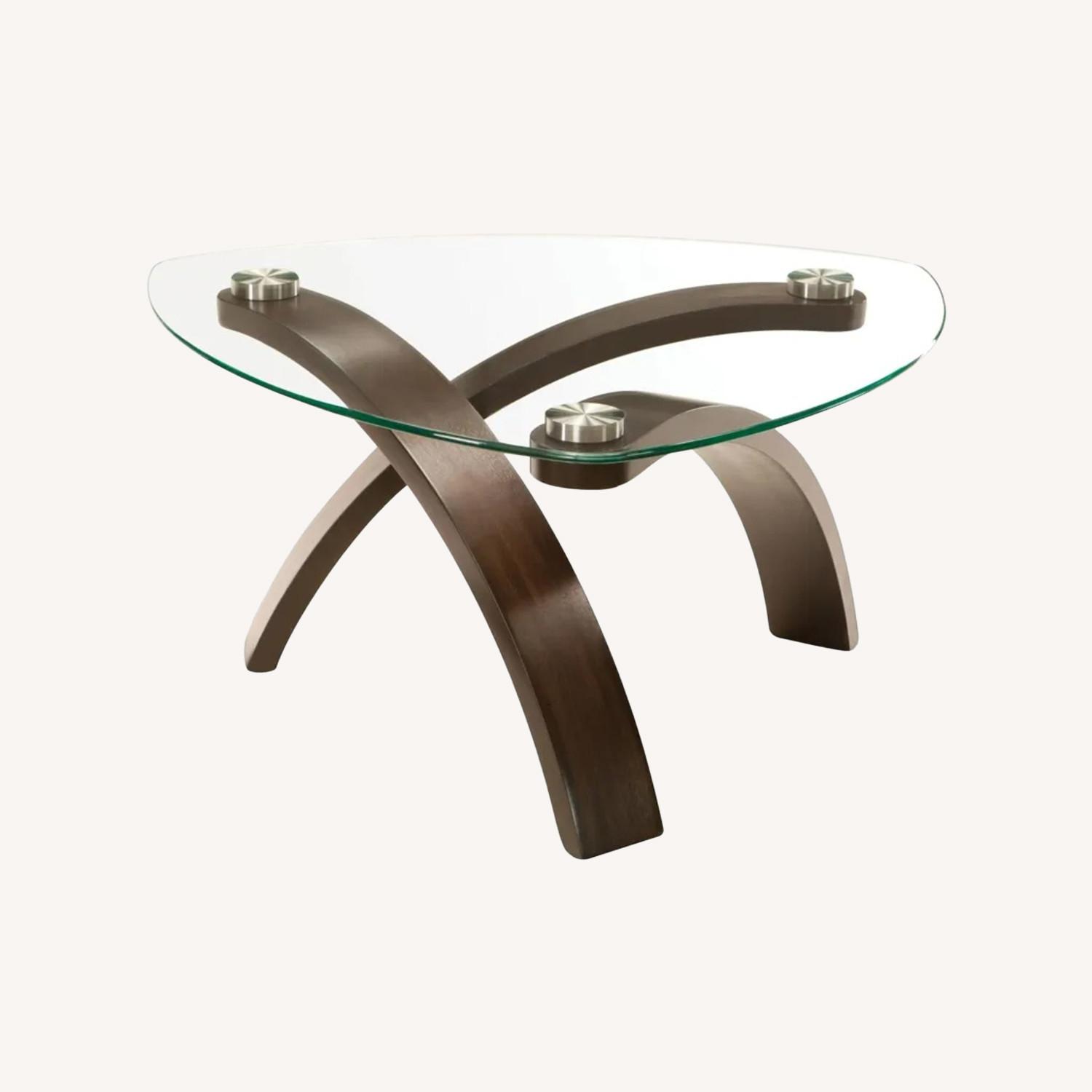Give your living room a cool modern twist with this on-trend Allure glass coffee table. Its simple yet strikingly unique design features a triangular-shaped glass tabletop held up by 3 curved legs with a rich hazelnut finish.