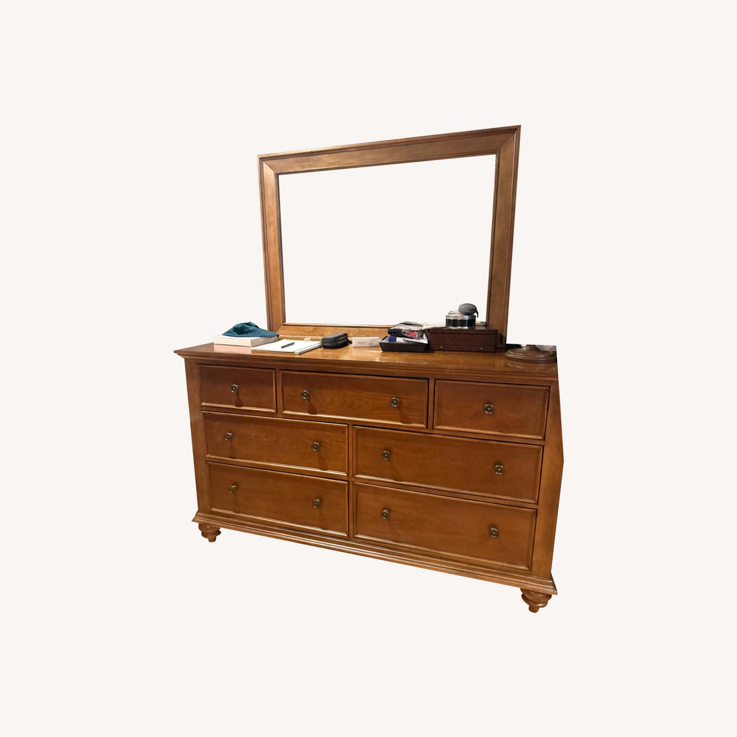 Seller's Notes:Raymour & Flanigan dresser with 9 drawers and matching framed mirror. Transitional design with warm wood tone and round hardware. Solidly built and in excellent overall condition. Dimensions: • Dresser: 66” W × 20” D × 39.5” H • Mirror: 49” W × 36.5” H