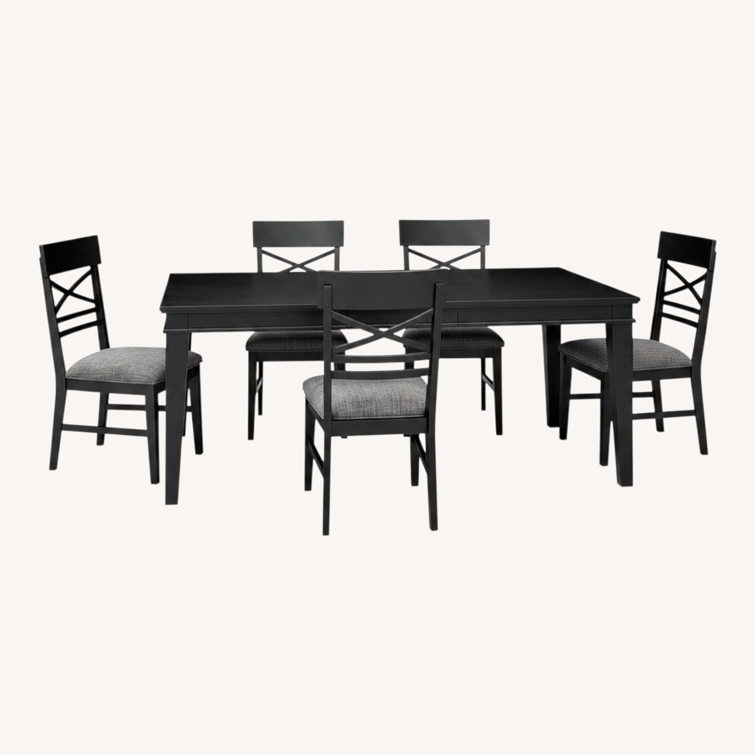 Breakfast, lunch or dinner, dine in style with the Halden 7-pc. dining set. Perhaps the first thing you'll notice is this group's bold black wood finish, which leans toward contemporary style. Don't be fooled, however, as Halden looks wonderful in a more transitional space as well. Plus, gray upholstered seats have an attractive tweed look and provide ample comfort for dinnertime conversations.