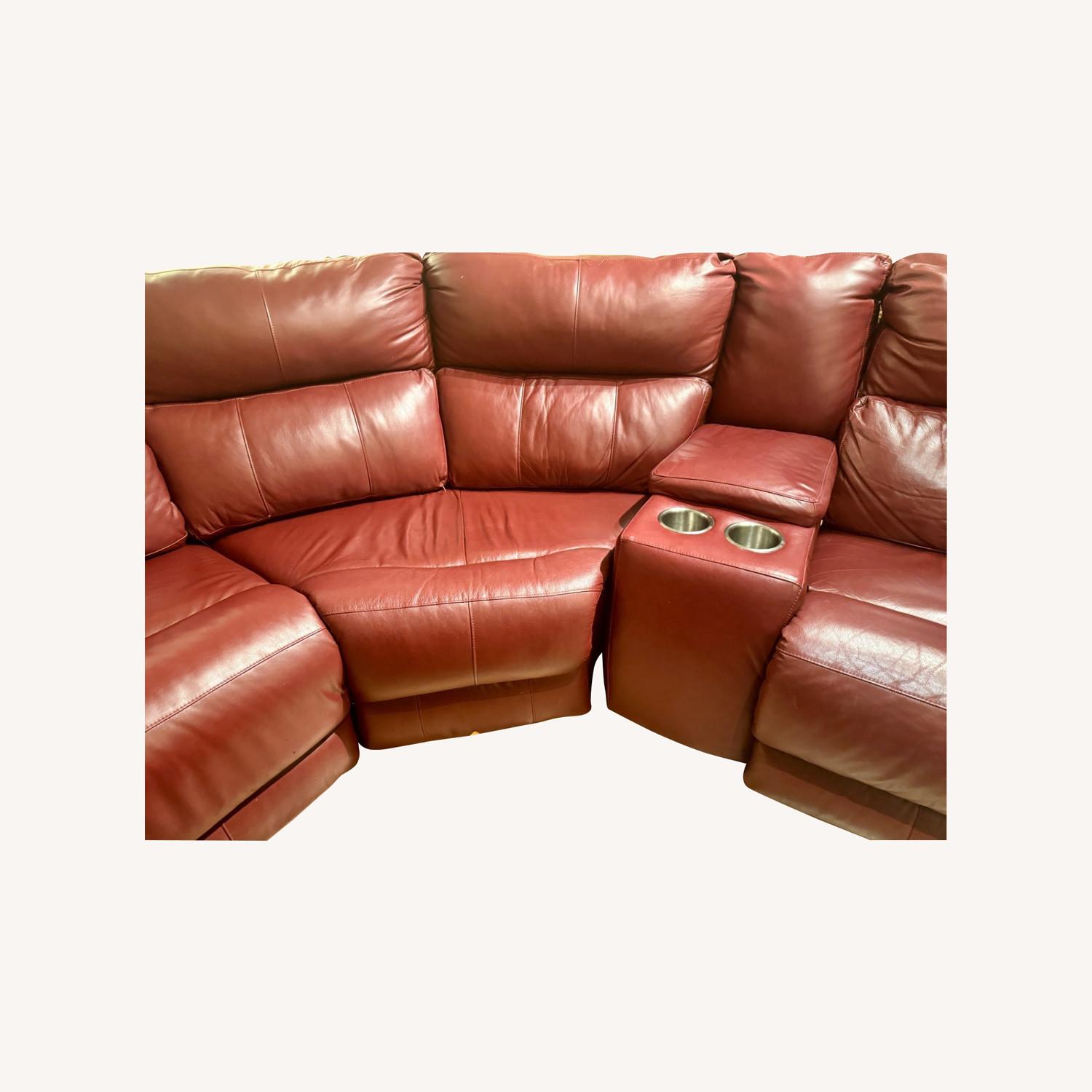 Seller's Notes:All Leather Sectional. Thick, wide Cushioned Seats. Cup Holder Section holds 2 cups and storage compartment . Color : Marinara