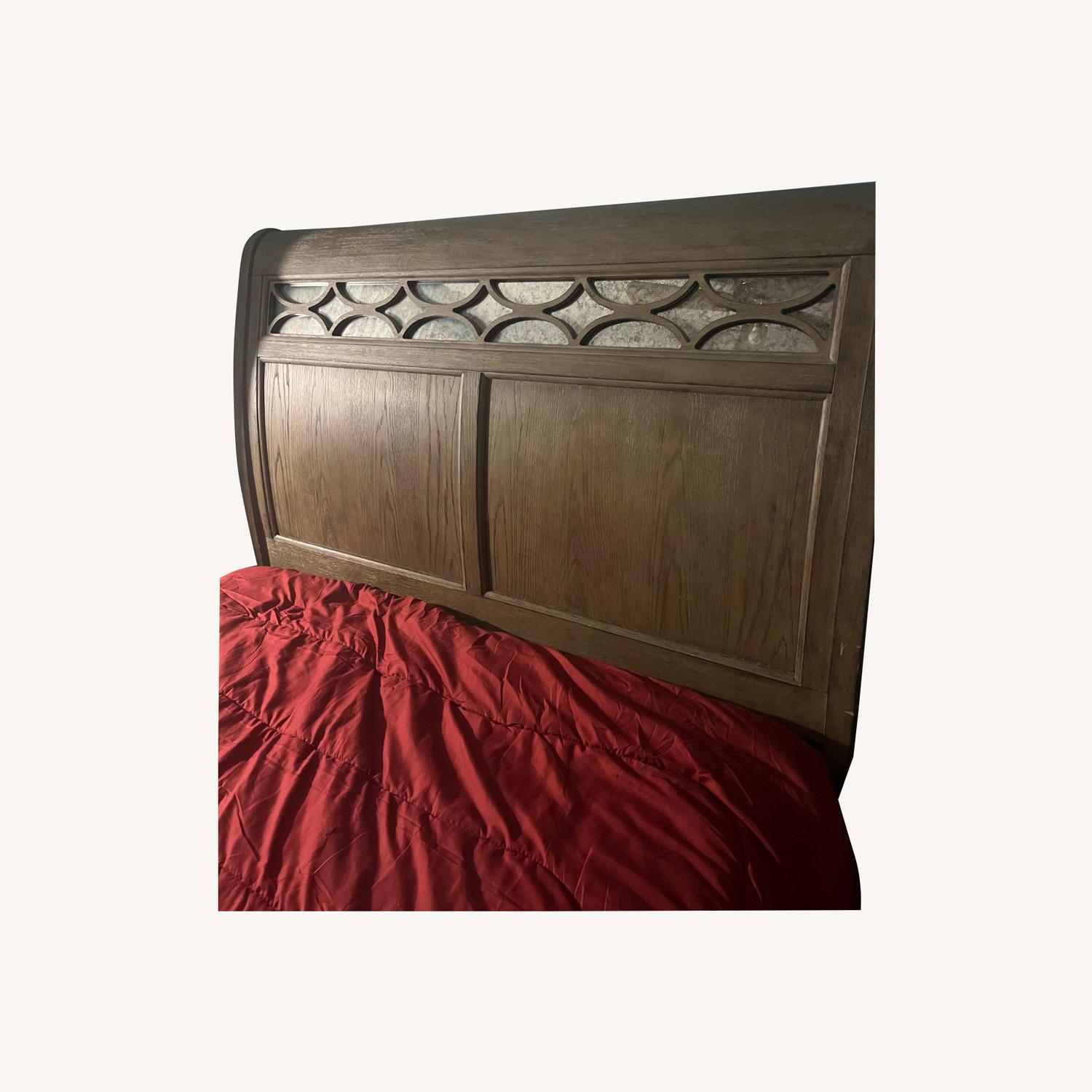 Seller's Notes:Queen rustic brown wood sleigh bed with smoked mirrors carved in the headboard