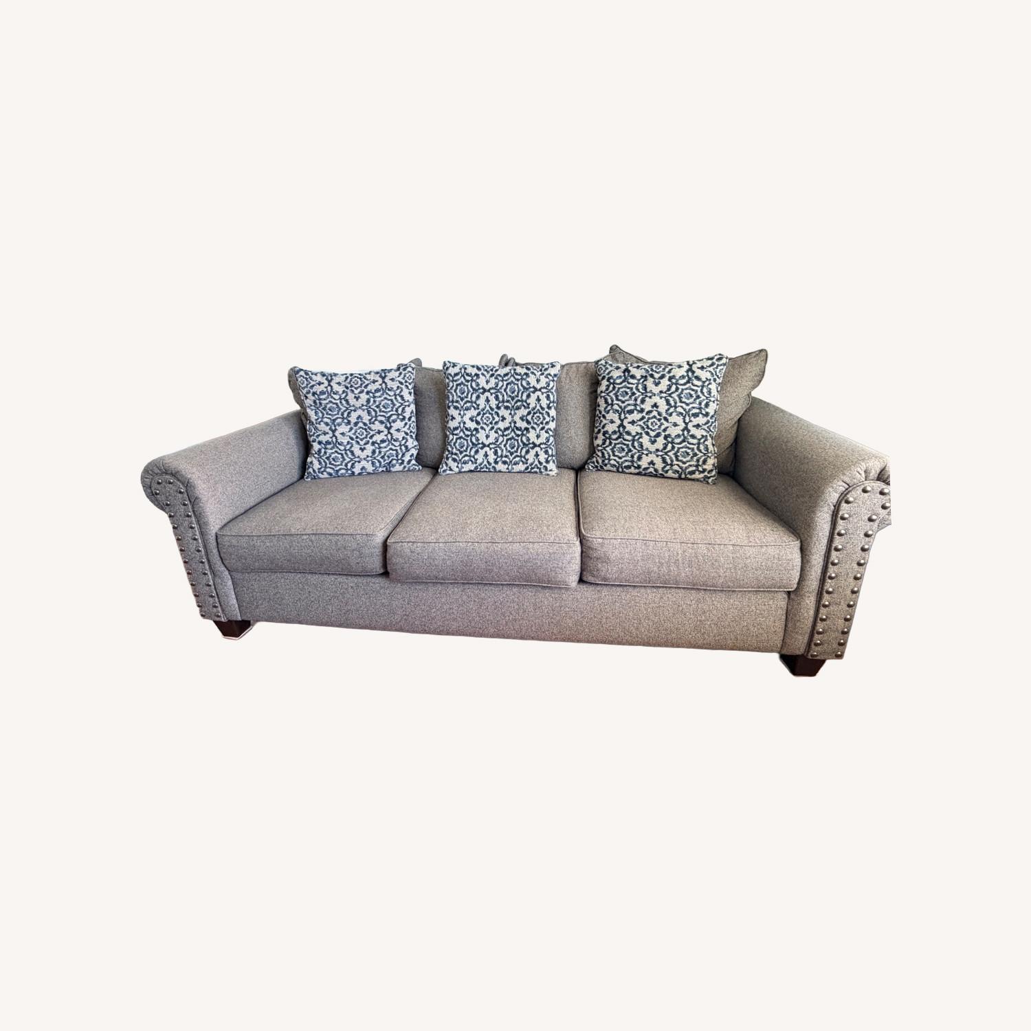 Manufacturer Link: Raymour & Flanigan Grey fabric couch with Blue cushions -...